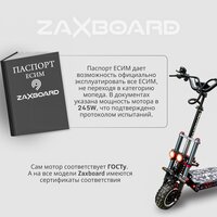 Наша компания первая в России выпустила официальный паспорт эсим, который вы можете предъявить сотруднику ГИБДД, в случае проверки вас на наличие водительского удостоверения и соответствия вашего эсим новым поправкам в законе. В паспорте эсим будет вся необходимая документация: Сертификат соответствия на эсим, протокол испытания на мотор-колесо TEM 245, протокол испытания на соответствие степени аквазащиты, технические характеристики вашего эсим, серийный номер вашего эсим, гарантийный талон и инструкция пользования. Таким образом у вас на руках будет документ, дающий право эксплуатировать эсим производства компании ZAXBOARD не имея водительского удостоверения, полностью легально и в соответствии с последними поправками в законе.