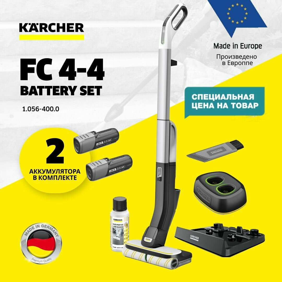 | Комплектация | Электрошвабра - 1 шт Аккумулятор Battery Power 2,5 Ач - 2 шт Быстрозарядное устройство Battery Power 4 В - 1 шт Универсальные роликовые щетки - 2 шт Универсальное средство для уборки полов RM 536 - 1 шт Базовая станция с функцией очистки Щетка для чистк |