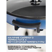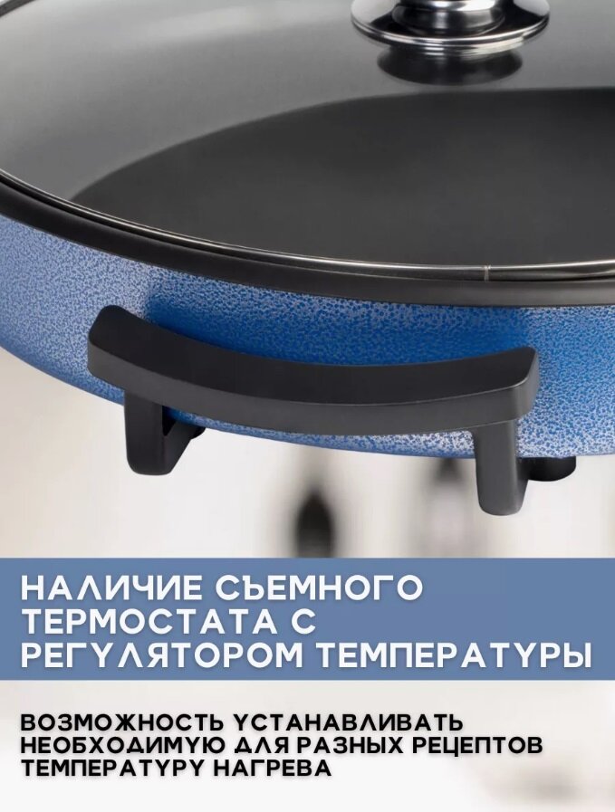 Электросковорода GALAXY GL2663 — это мобильный прибор для жарки, тушения, варки и запекания продуктов. Высокая мощность 1700 Вт, диаметр 38 см и глубина 4 см. обеспечивает быстрое приготовление большого объема продуктов. Высококачественное антипригарное покрытие не содержит вредных веществ, безопасно для здоровья, устойчиво к высоким температурам. Благодаря постепенному и равномерному нагреву пища не пригорает и не прилипает, позволяя готовить с минимальным количеством масла, сохраняя все полезные витамины и микроэлементы в продуктах. Дополнительное преимущество электросковороды GALAXY - наличие съемного термостата с регулятором температуры. Вы сможете устанавливать необходимую для разных рецептов температуру нагрева. Встроенный нагревательный элемент значительно быстрее нагревает рабочую поверхность электросковороды, чем плита обычную сковороду. Электросковорода GALAXY GL2663 оснащена жаропрочными ручками, которые не нагреваются и удобны для переноски. Крышка выполнена из термостойкого стекла с отверстием для выхода пара. Такая конструкция исключает образование конденсата и позволяет контролировать процесс приготовления. Электросковорода GALAXY станет незаменимым прибором в местах, где нет газовой или электроплиты: на даче, в офисе и пр. Легкая, вместительная и мобильная электросковорода GL2663 заменит множество приборов на вашей кухни.