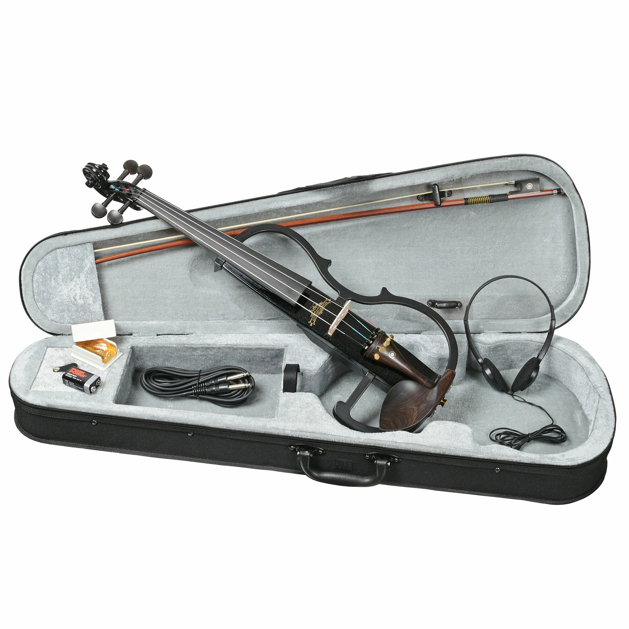 - в комплект входит: скрипка + смычок + кейс + канифоль + наушники, батарейка тип крона, шнур