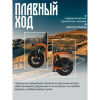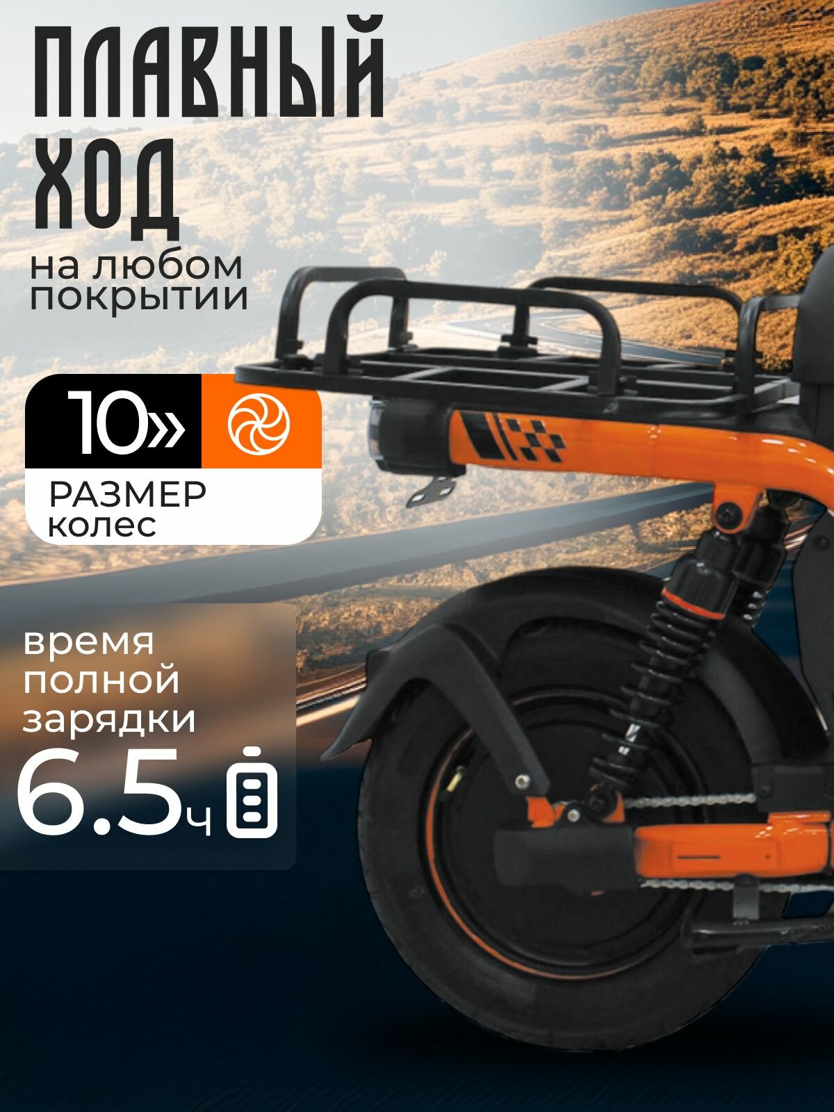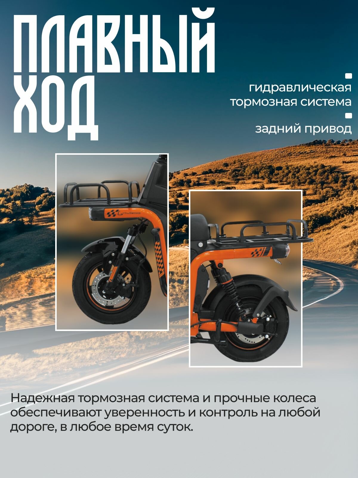Прочная конструкция и большие колеса обеспечивают плавность хода и отличную устойчивость на различных дорожных покрытиях. Электроскутер оснащен багажником спереди и сзади, что делает его отличным выбором для курьеров или тех, кто нуждается в перевозке небольших грузов.