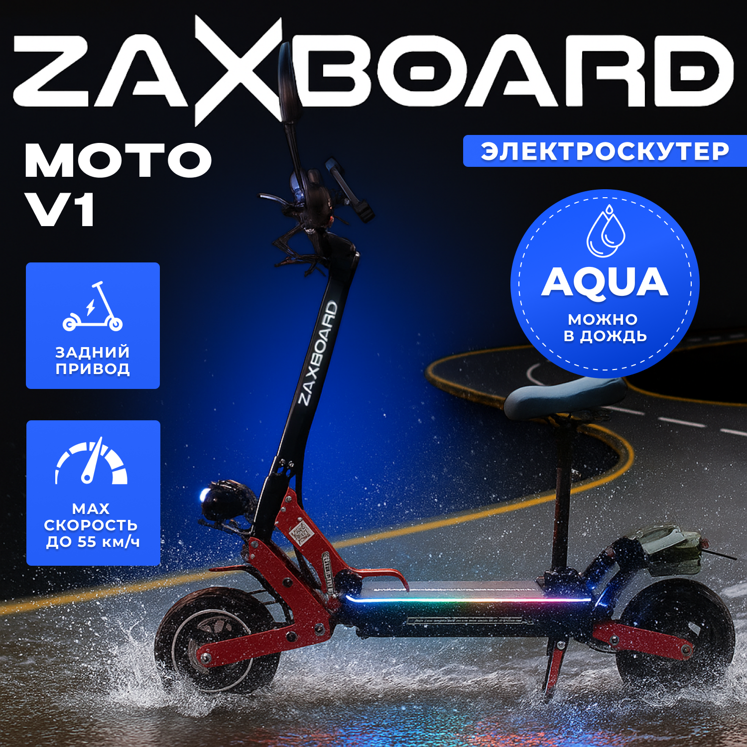 Электроскутер с сиденьем ZAXBOARD MOTO V1 AQUA, 1440W, 18AH, аквазащита, ручка газа.: сравнение цен, характеристики, фото, актуальное наличие и цены.