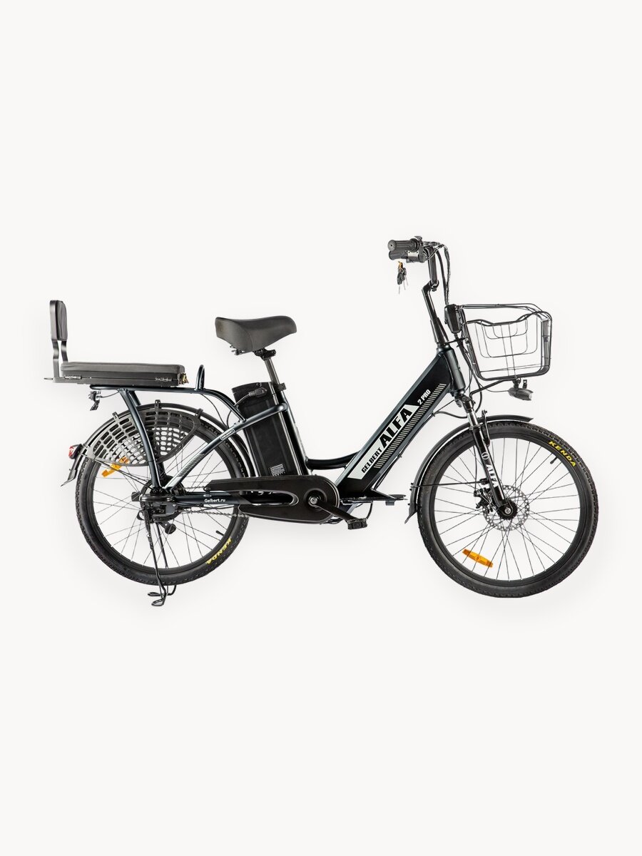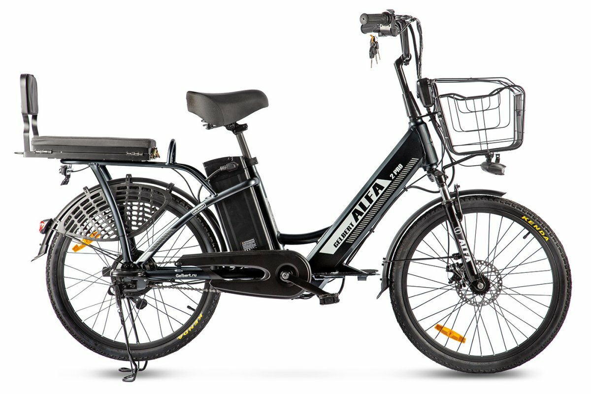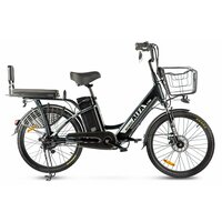 Комфортабельный электровелосипед без переключения передач. Подходит для прогулочного катания в городских условиях и по несложным маршрутам в лесу. Диаметр колес - 24 дюйма. Вес - 36 кг. Грузоподъемность - до 110 кг. Пробег на одной зарядке - до 40 км. Максимальная скорость - до 30 км/ч. Технические особенности: алюминиевая рама (Hardtail, интегрированный багажник), амортизационная вилка пружинного типа, двойные алюминиевые обода (под ниппель AV), передний тормоз - дисковый механический (ротор 160 мм), задний тормоз - барабанный, редукторный мотор мощностью 500 Вт, литий-ионная батарея емкостью 13 Ah, защита цепи, длинные металлические крылья, задний багажник с сиденьем и спинкой, комфортное седло, передняя корзина, система освещения, центральная подножка, подножки для водителя и пассажира, зеркала заднего вида.