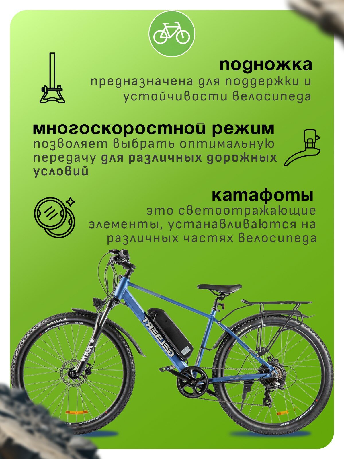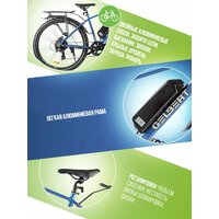 Особенности велосипеда: Алюминиевая рама, Амортизационная вилка, Багажник, Гидравлический привод тормозов, Двойные обода, Дисковые тормоза, Защита цепи, Звонок, Катафоты, Крылья, Многоскоростной, Подножка, Уровень заряда, Фонарь.