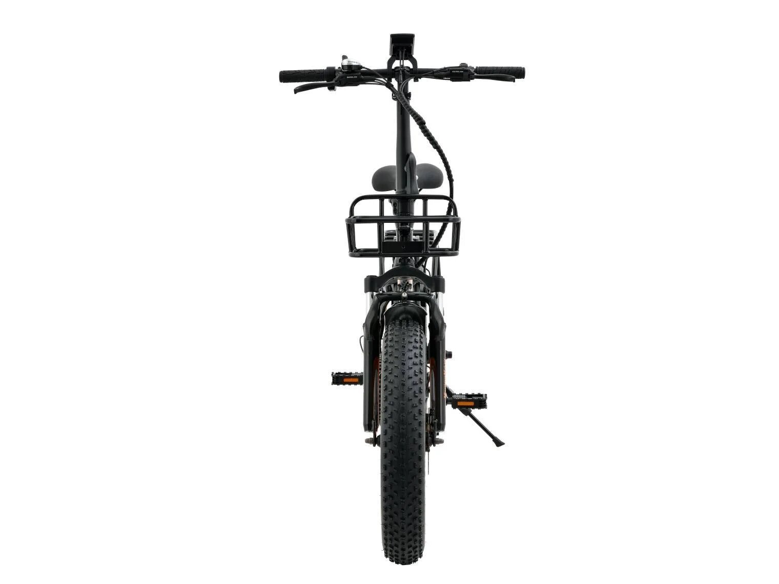 На рулевой стойке расположен вместительный бокс для транспортировки грузов. Электровелосипед подойдет для перевозки личных вещей, продуктов из магазина, хозяйственных товаров, а также применителен к профессиональной деятельности - курьерская служба. Модель предназначена для практичных людей. По центру размещен огромный яркий светодиодный фонарь.