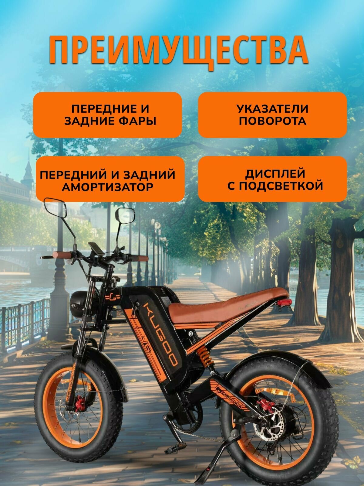 Электровелосипед KUGOO V6 - стильный и функциональный выбор для любителей активного образа жизни. Модель 2025 года выполнена в черном и оранжевом цвете, что придает ей привлекательный внешний вид.