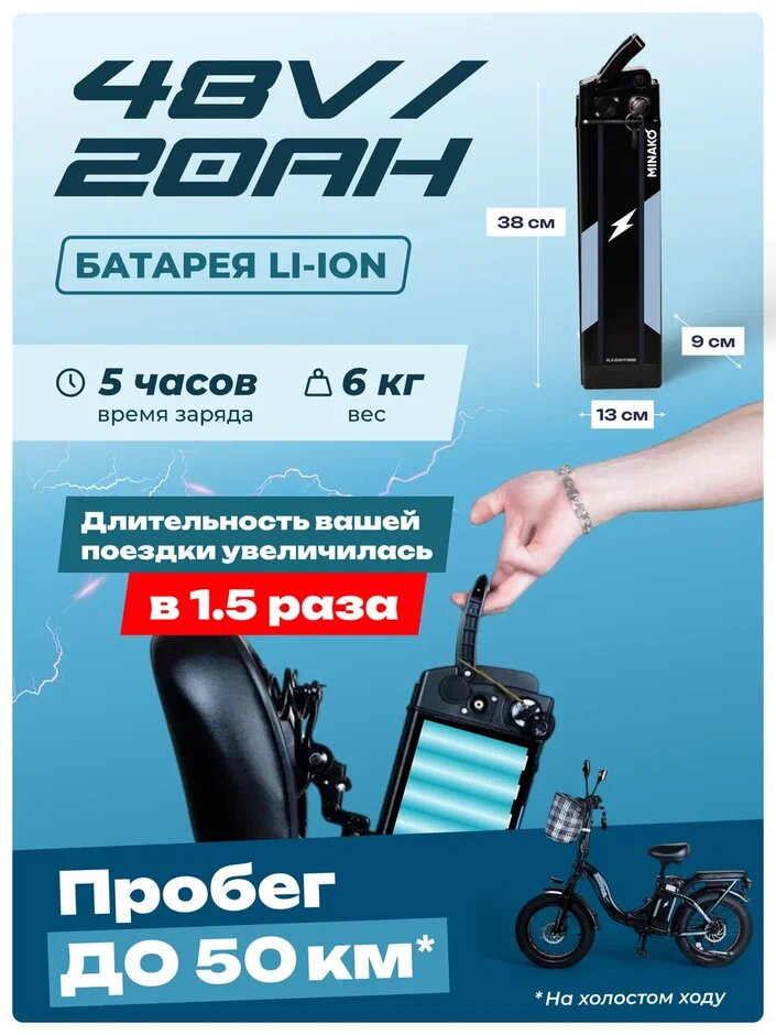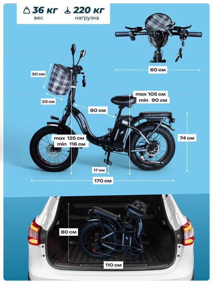 Электровелосипед OxyVolt "Low Fat Ranger" 750Вт, 48В, 18Ач, гидравлика, фэтбайк, складной, 20 дюймов, черный