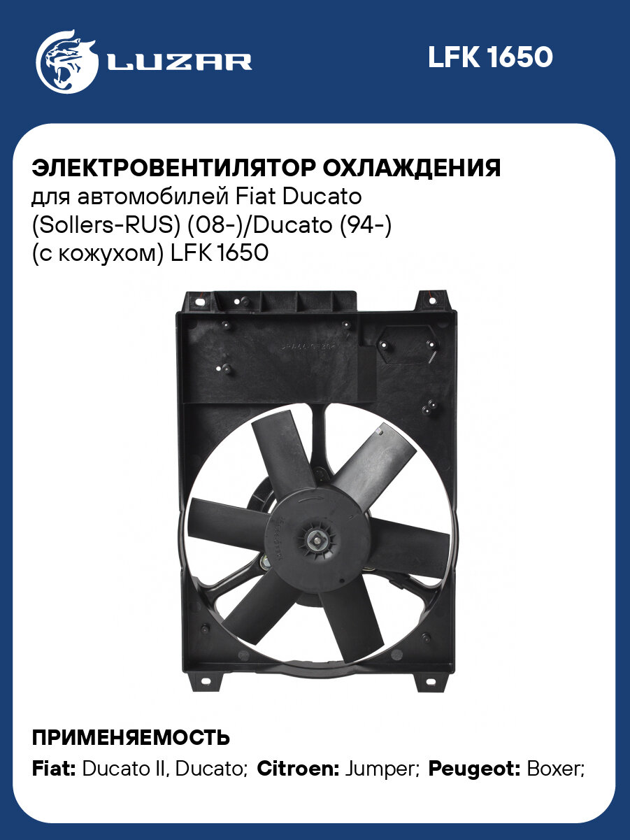 Электровентилятор охлаждения для автомобилей Fiat Ducato (Sollers-RUS) (08-)/Ducato (94-) (c кожухом) LFK 1650 LUZAR: сравнение цен, характеристики, фото, актуальное наличие и цены.