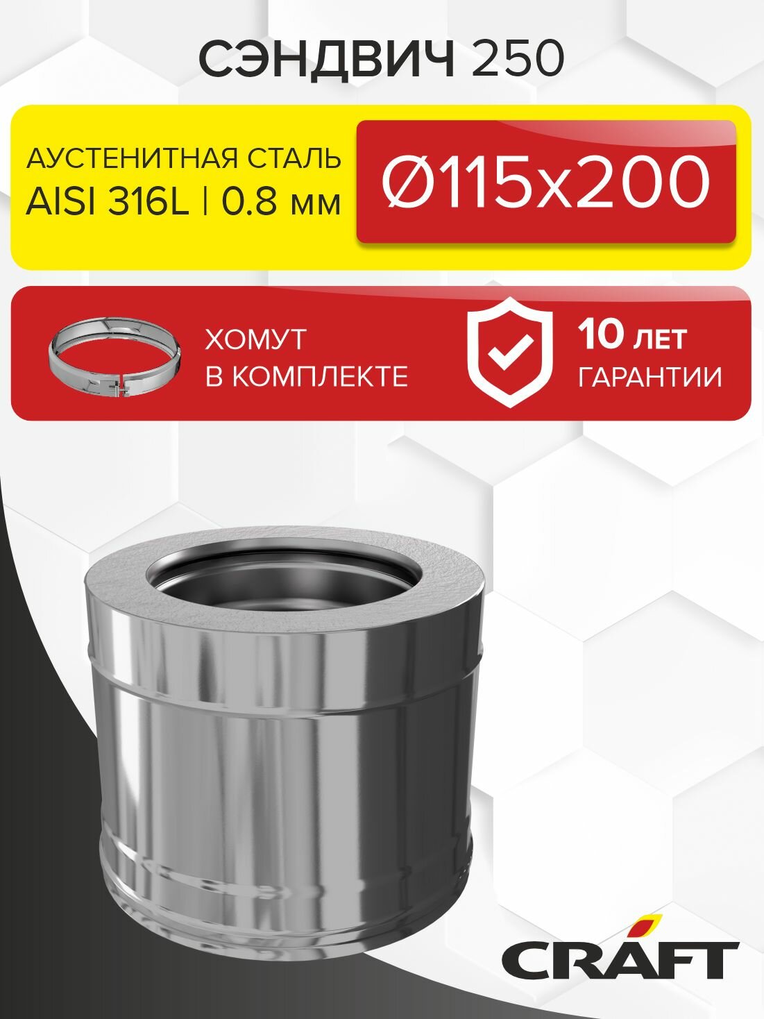 Купить Элемент дымохода Сэндвич труба 250 Craft HF-50B (316/0,8/304/0,5) Ф115х200 с доставкой по всей России.