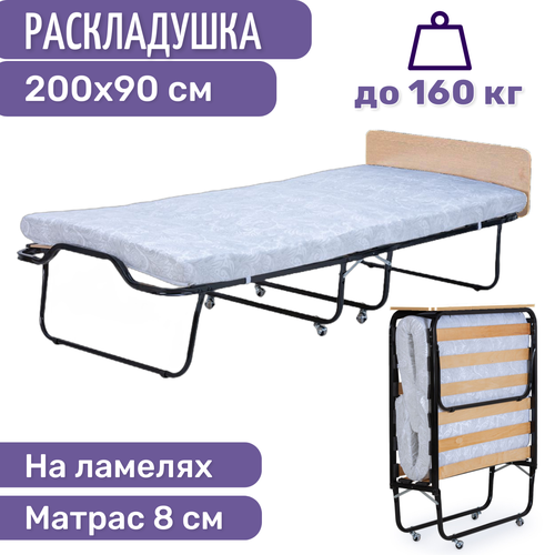 Технические характеристики: - Цвет товара: дуб - Тип: раскладушка - Полотно: ламели - Материал каркаса: сталь - Полимерное покрытие каркаса: Да - Матрас в комплекте: Да - Подголовник: Да - Колеса: Да - Максимальная нагрузка: 160 кг - Высота в собранном виде: 115 см - Ширина в собранном виде: 90 см - Толщина в собранном виде: 30 см