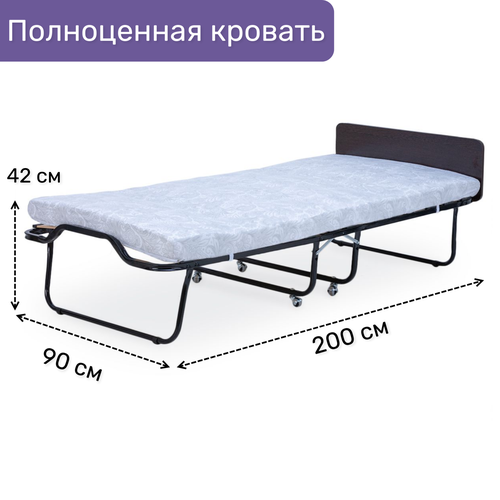 Раскладушка "Элеонора Премиум-М" с матрацем, состоящим из полужесткого холконового листа (толщина 80 мм) и комфортным спальным размером 200*90 см. Матрас надежно крепится к каркасу при помощи липучек. Материал основания кровати Элеонора М - 14 ламелей. Столешница -преимущество данной модели выполнена из ЛДСП (цвет Венге). Диаметр трубы - 25 мм с квадратным сечением и 4 ножки опоры и металлические прорезиненные колеса дают возможность для нагрузка на кровать "Элеонора Премиум-М" до 160 кг.