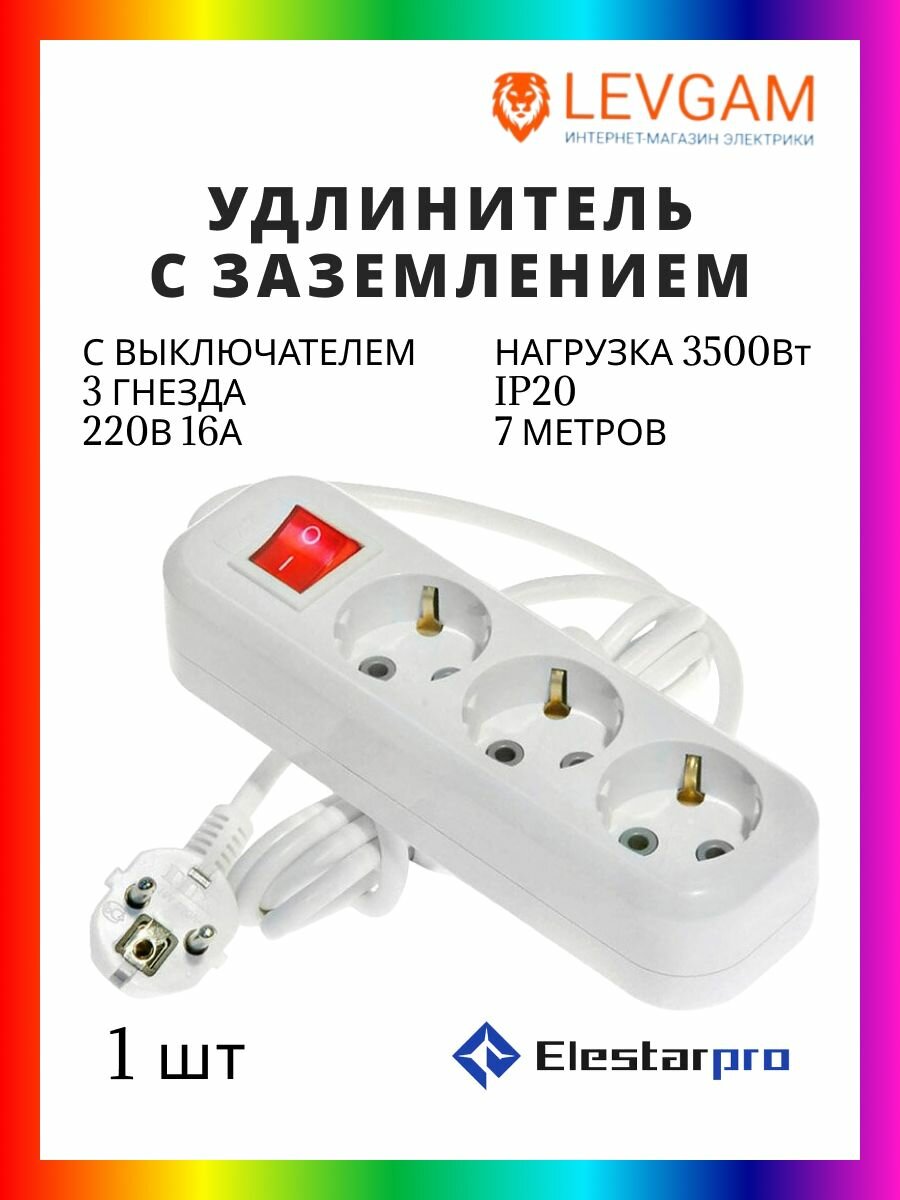 Купить ElestarPro Удлинитель с/з 3 гнезда ПВС 3х1,0 16А 3,5кВт 7 метров с выключателем, белый с доставкой по всей России. ElestarPro Удлинитель с/з 3 гнезда ПВС 3х1,0 16А 3,5кВт 7 метров с выключателем, белый: сравнение цен, характеристики, фото, актуальное наличие и цены.