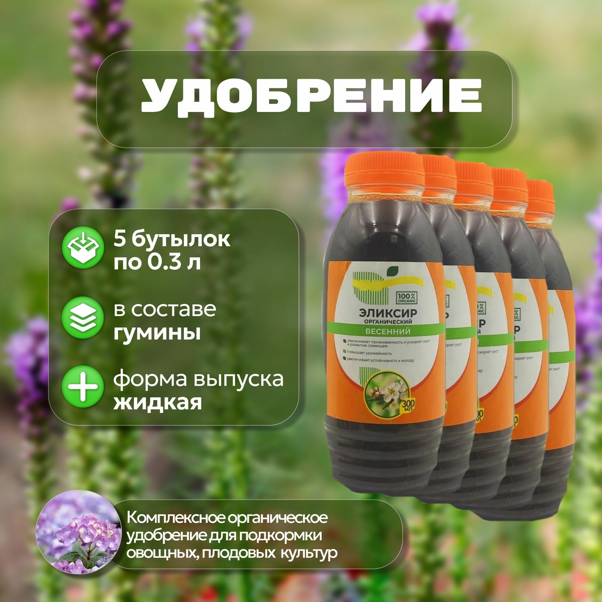 Эликсир органический весенний, 5 бутылок по 0,3 л. Эффективное комплексное органическое удобрение, разработанное для подкормки овощных, плодово-ягодных, цветочно-декоративных культур в весенний период: сравнение цен, характеристики, фото, актуальное наличие и цены.