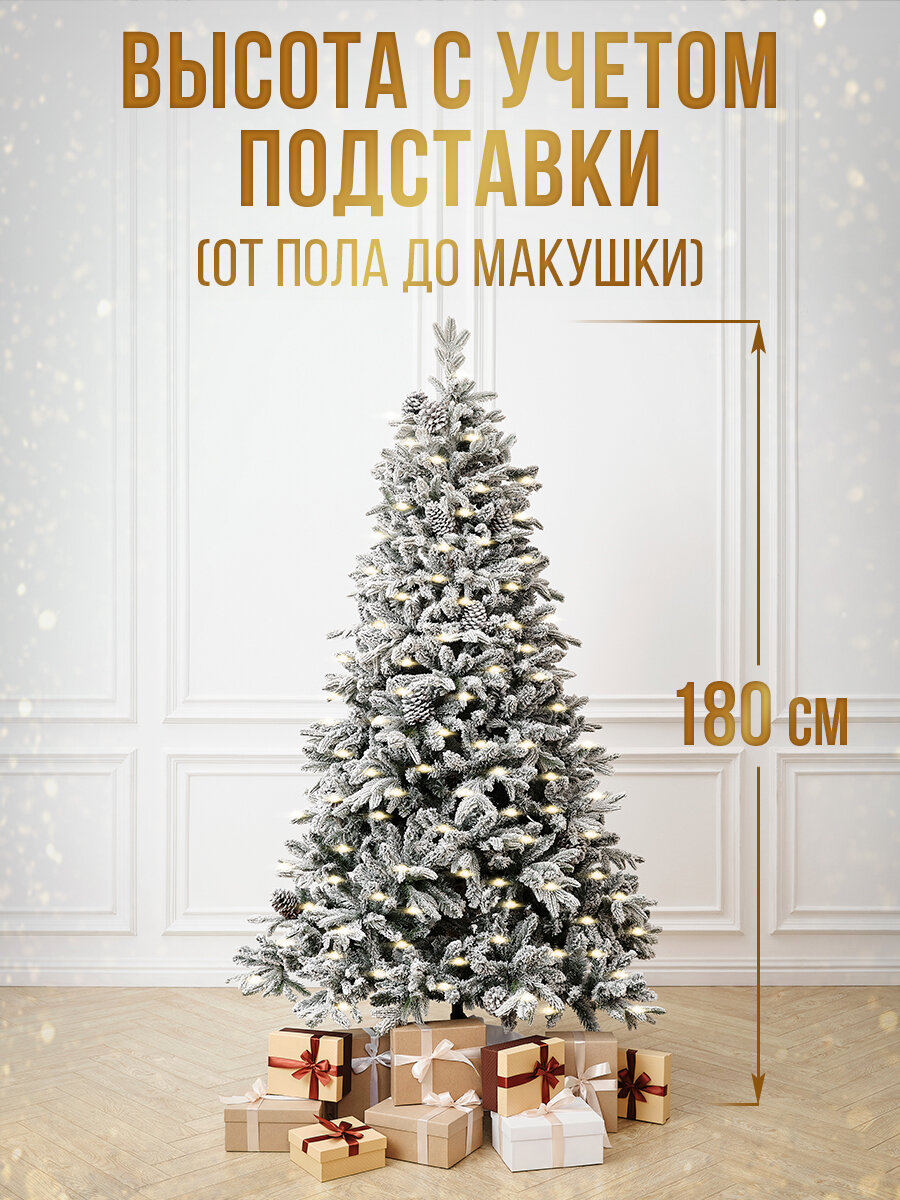 Елка новогодняя имеет высоту 180 см, что позволяет ей выглядеть впечатляюще и привлекать внимание. Диаметр нижнего яруса составляет 114 см, что обеспечивает достаточное пространство для размещения украшений и подарков.
