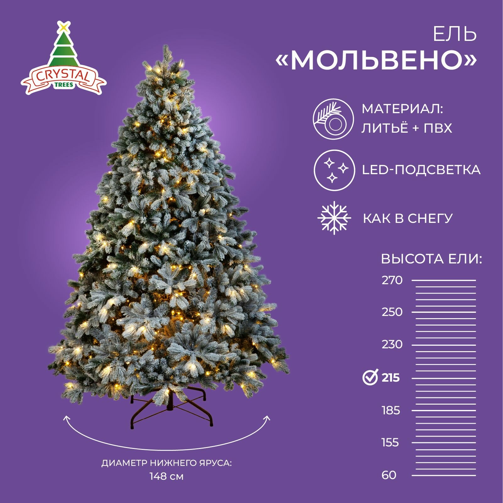 Елка искусственная новогодняя, МОЛЬВЕНО в снегу с гирляндой, Crystal Trees, литая хвоя, 1410 веточек, высота 215 см.: сравнение цен, характеристики, фото, актуальное наличие и цены.