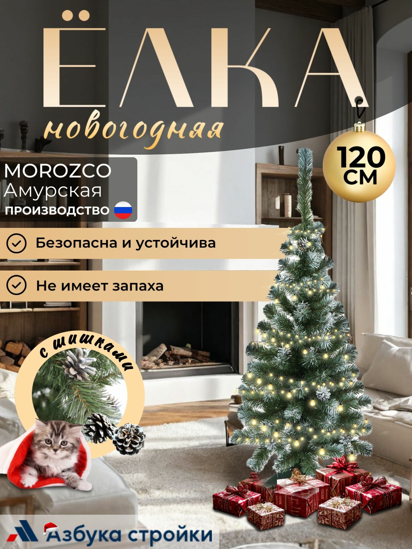 Купить Елка искусственная новогодняя с шишками заснеженная 120 см Morozco Амурская, 100% ПВХ, зеленая с доставкой по всей России.