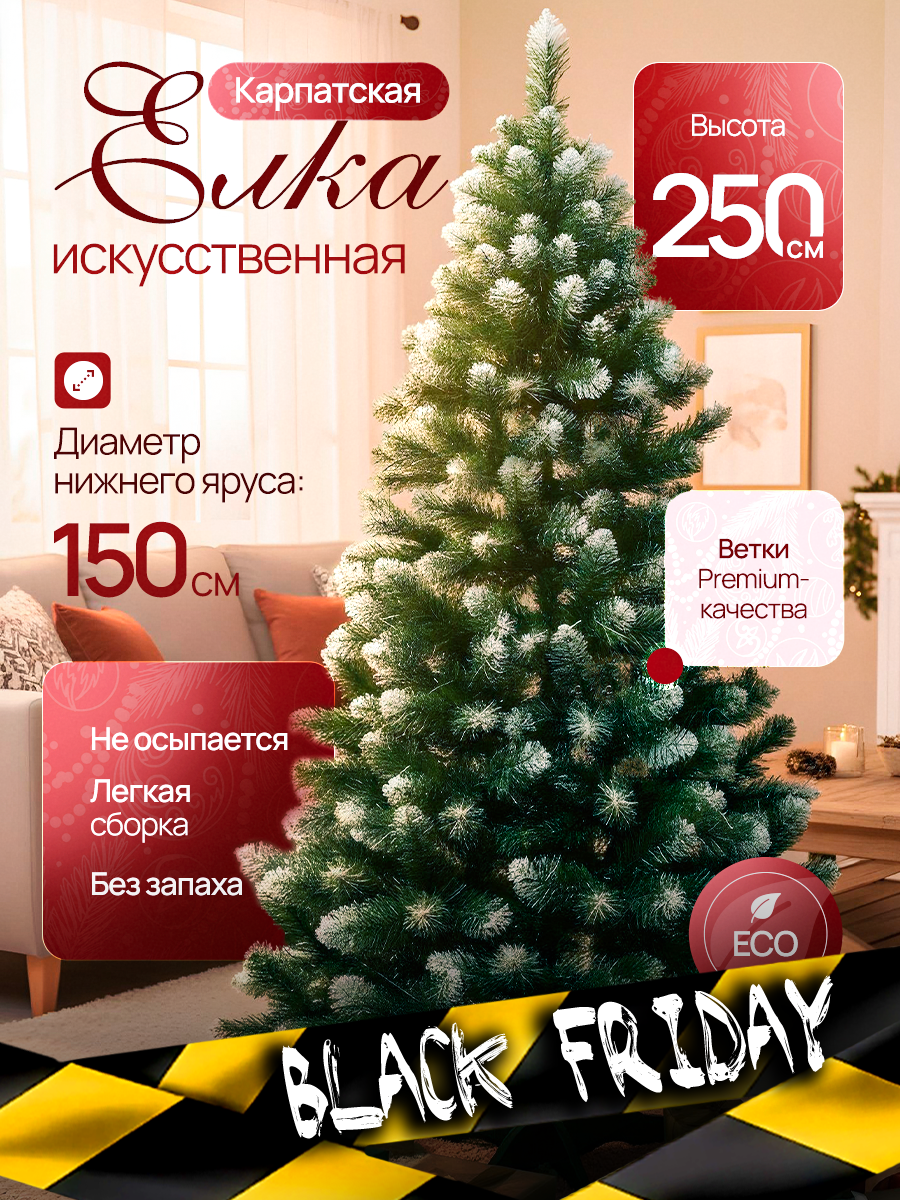 Новогодняя искусственная елка "Карпатская" обязательный атрибут каждого дома на Новый год и Рождество. Ель впечатляет своим реалистичным дизайном. Ель напольная имеет декоративное снежное напыления ветвей, которое служит приятным дополнением к её насыщенному зелёному цвету, сразу навевая новогоднее настроение.