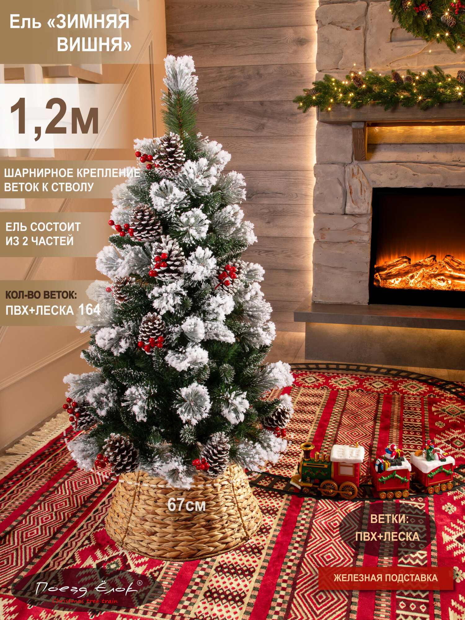 Погрузитесь в волшебную атмосферу зимнего волшебства с нашей заснеженной искусственной елкой 120 см (высота с учётом подставки) с шишками и ягодами из серии «Зимняя вишня»! Для украшения елки использовано напыление в виде искусственного снега, а также ягоды и шишки. Это придает новогодней заснеженной красавице еще больше нарядности. Снег абсолютно безопасен, не пахнет. Возможно небольшое осыпание напыления искусственного снега, что является нормой. Напольная ёлка имеет плотную и густую ветвистую форму. Она прослужит много лет, не выцветая и не осыпаясь. Материал елки: литые ветки (иголки) + пленка ПВХ (основание веток и ствол). Высота от пола до нижнего яруса 23 см. Крепление веток: отгибное. Чтобы собрать нашу искусственную елку, достаточно соединить 2 части дерева между собой, и ветки сами займут горизонтальное положение. Подставка: железная. Упаковка: плотная коробка, в которой можно хранить ель 1.20 м между праздниками. Эта элегантная ель высотой 1,20 м легко собирается и разбирается. Ветки после распаковки сразу же восстанавливают форму. Она безопасна в эксплуатации даже для детей и детского праздника, не мнется, не имеет запаха и не вызывает аллергии. Благодаря использованию новейших 3D технологий ветки у елочки пушистые и реалистичные! Такая красивая елка идеально подходит для семейного праздника на Новый год и Рождество для квартиры, дачи или офиса. Используйте ее для украшения фотостудии, лофта, квартиры, комнаты, дома и офиса. В ассортименте Поезд Ёлок вы найдете много разных вариантов гирлянд и других елок. Чтобы увидеть весь наш ассортимент, нажмите на логотип Поезд Ёлок и перейдите в наш магазин.