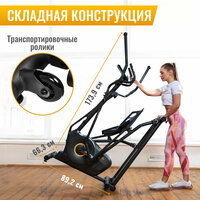 Тренажёр удобно хранить, благодаря складной системе. В сложенном виде он не занимает много пространства. Модель оснащена транспортировочными роликами, что позволяет легко перемещать его в доме или квартире. В комплектацию входят инструменты для сборки.