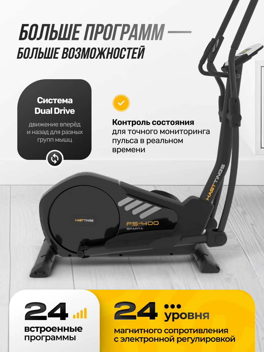 Эллиптический тренажер Hasttings FS400 SPARTA — популярная модель для дома. Hasttings SPARTA получила популярность за надежность, комфорт и функциональность, а также за привлекательность и компактность.