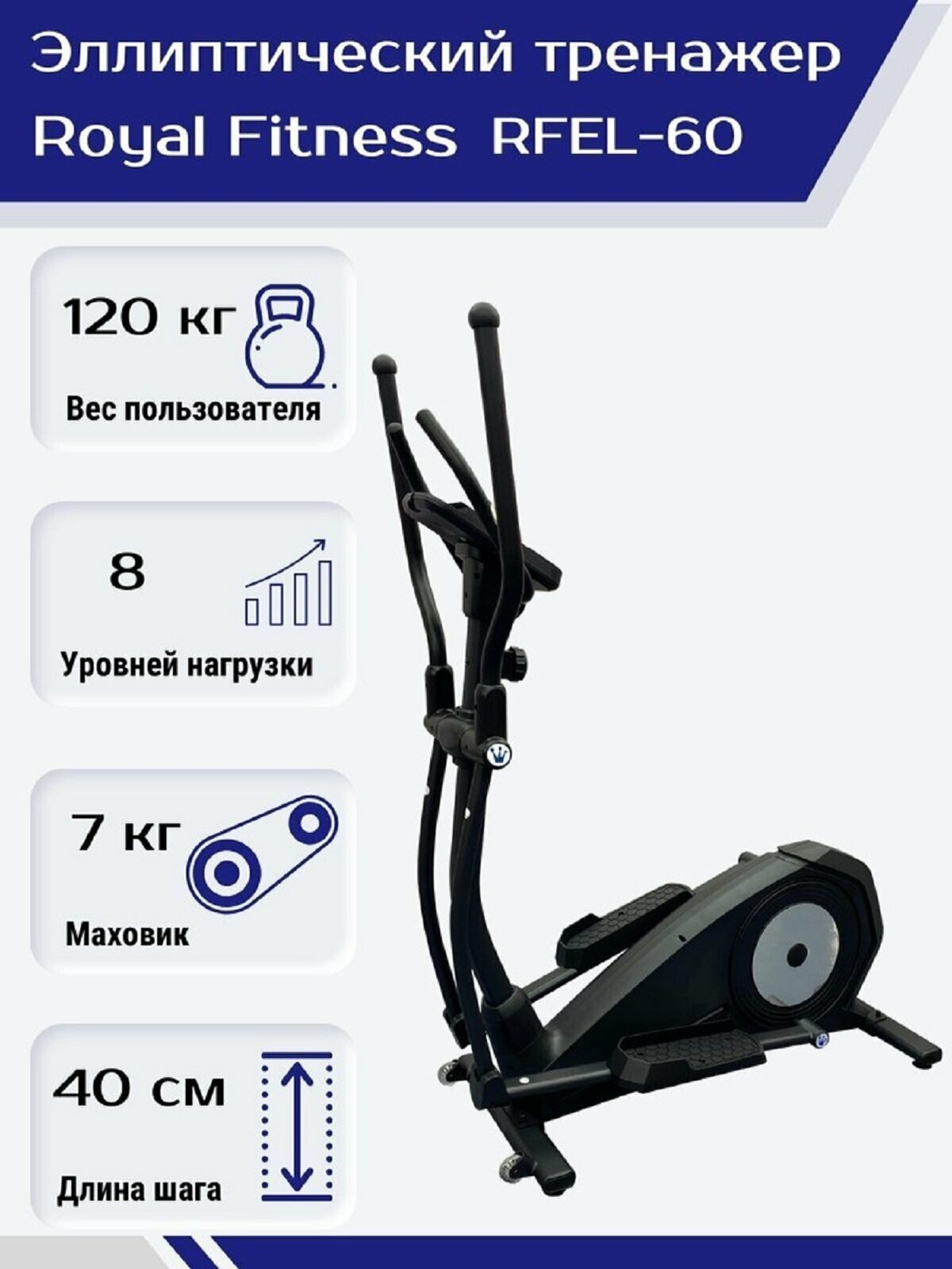 Эллиптический тренажер Royal Fitness RFEL-60, магнитная система нагрузки, длина шага 40 см: сравнение цен, характеристики, фото, актуальное наличие и цены.