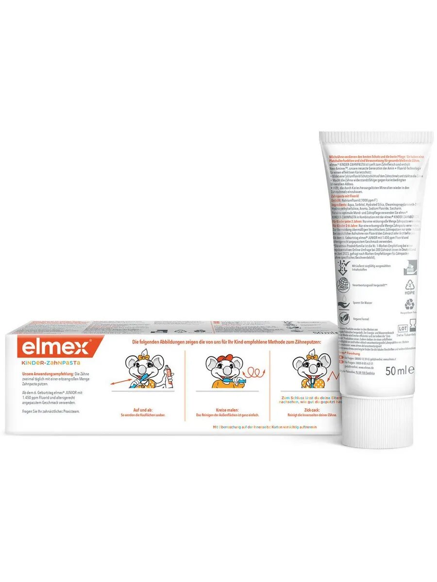 Детская зубная паста Elmex от 2-х до 6 лет c новой Технологией Neo-AminexTM, специально разработана для ежедневного ухода и защиты мягкой, еще не полностью сформировавшейся эмали молочных зубов вашего ребенка. Новая технология Neo -Aminex столь же эффективна, как и ранее используемый AmF(аминофторид). Фторид натрия (NaF) заменил Olaflur, новая аминная основа называется Oleaminopropylamineth-3 HCl. Зубная паста Elmex от 2-х до 6 лет обладает приятным и мягким, но не сладким вкусом, который не провоцирует ребенка к проглатыванию зубной пасты. Содержание действующих веществ специально адаптировано к потребностям организма ребенка в возрасте до 6 лет.