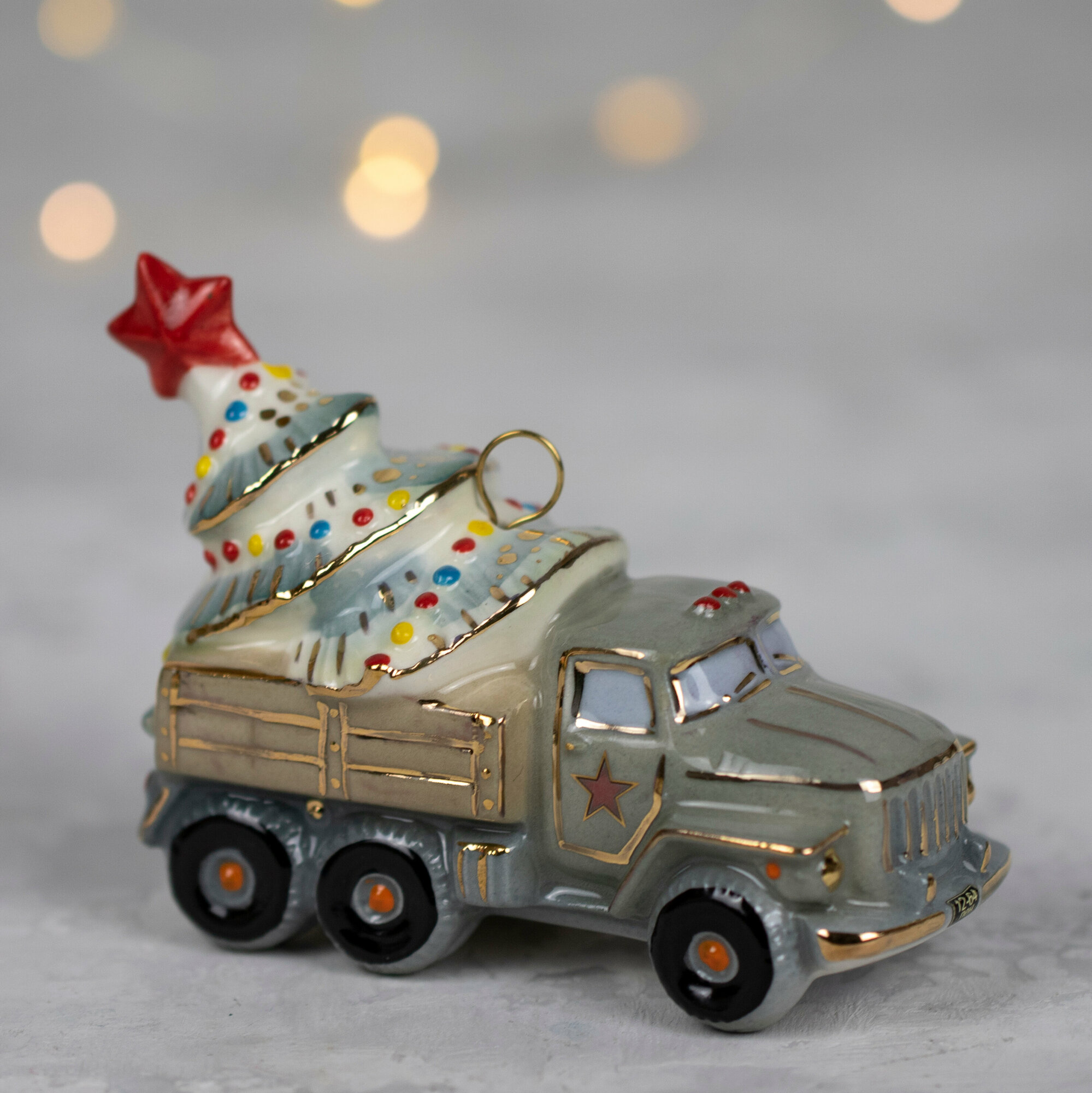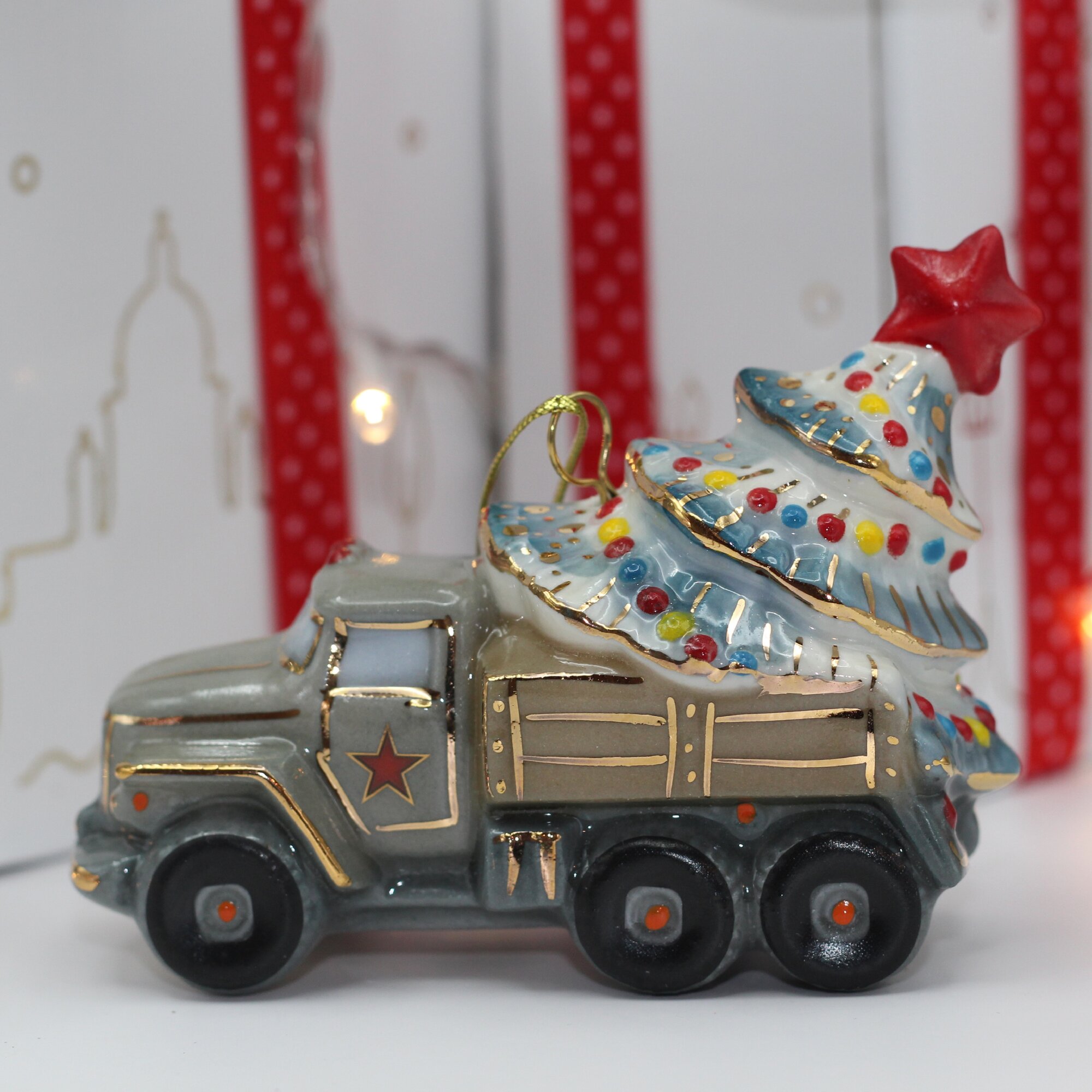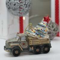 Елочная игрушка "Грузовик с ёлкой" изготовлена из глазурованного фарфора с подглазурной и надглазурной росписью. Имеет петельку и поставляется вместе с ленточкой. Оригинальный подарок детям и взрослым к Новому году и Рождеству.