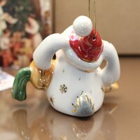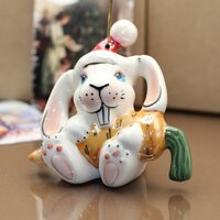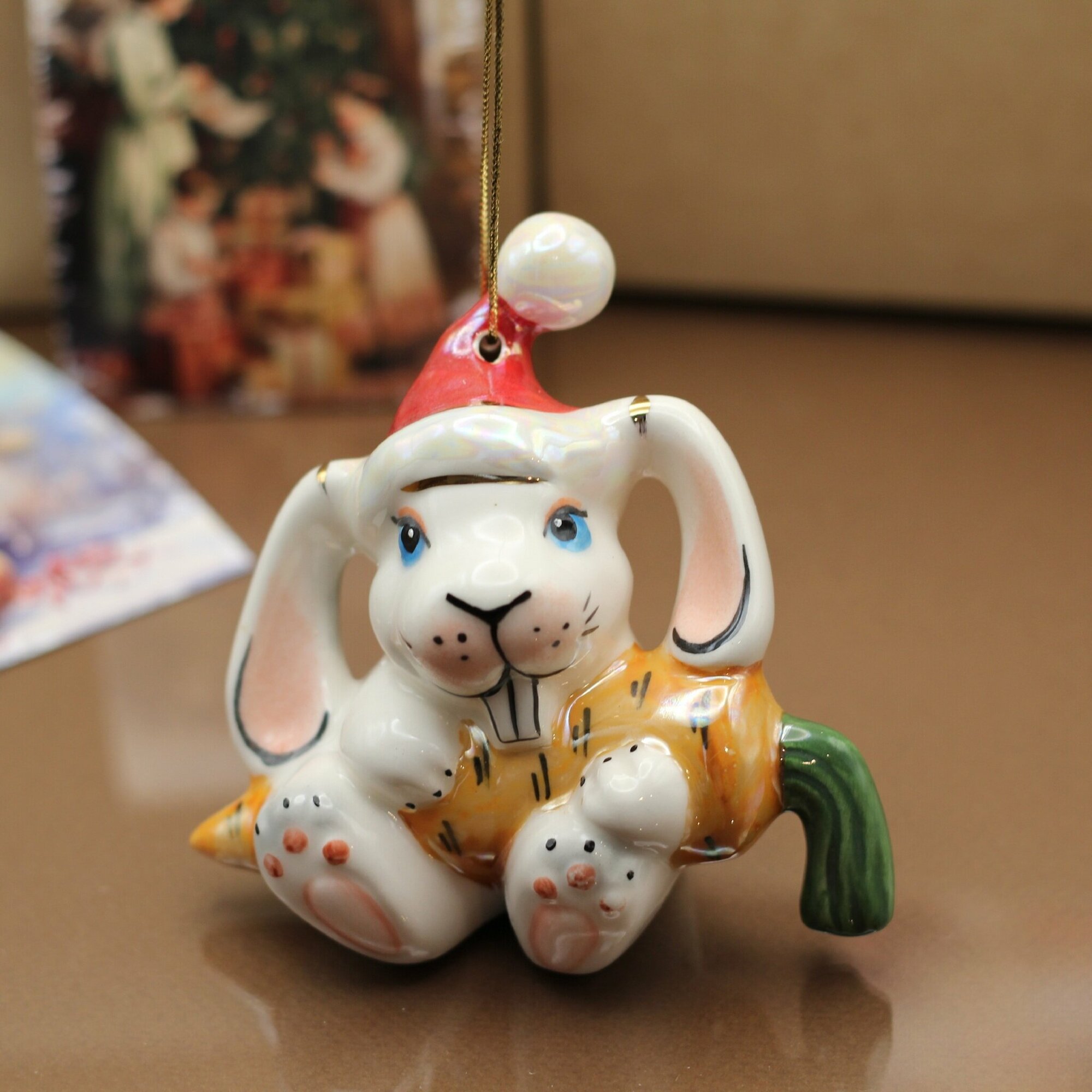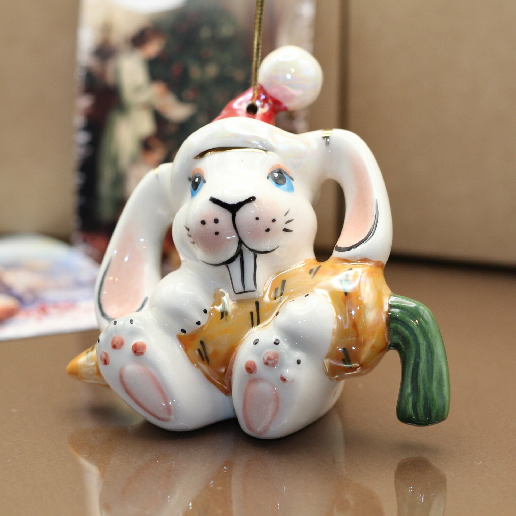 Елочная игрушка "Кролик с морковкой" изготовлена из глазурованного фарфора с подглазурной и надглазурной росписью. Имеет петельку и поставляется вместе с ленточкой. Оригинальный подарок детям и взрослым к Новому году и Рождеству.