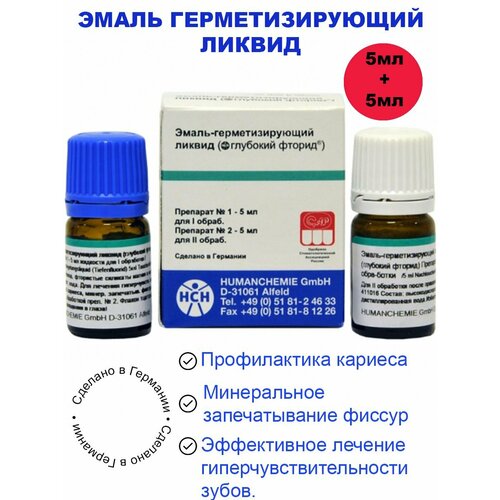Двухкомпонентный состав из эмаль-герметизирующей жидкости и гидроокиси-меди кальция (наносятся по очереди, не смешиваются) позволяет добиться глубокого фторирования. Предназначен для лечения при кариозных образованиях шейки зуба, профилактике и лечении кариеса зубной эмали, запечатывании фиссур.