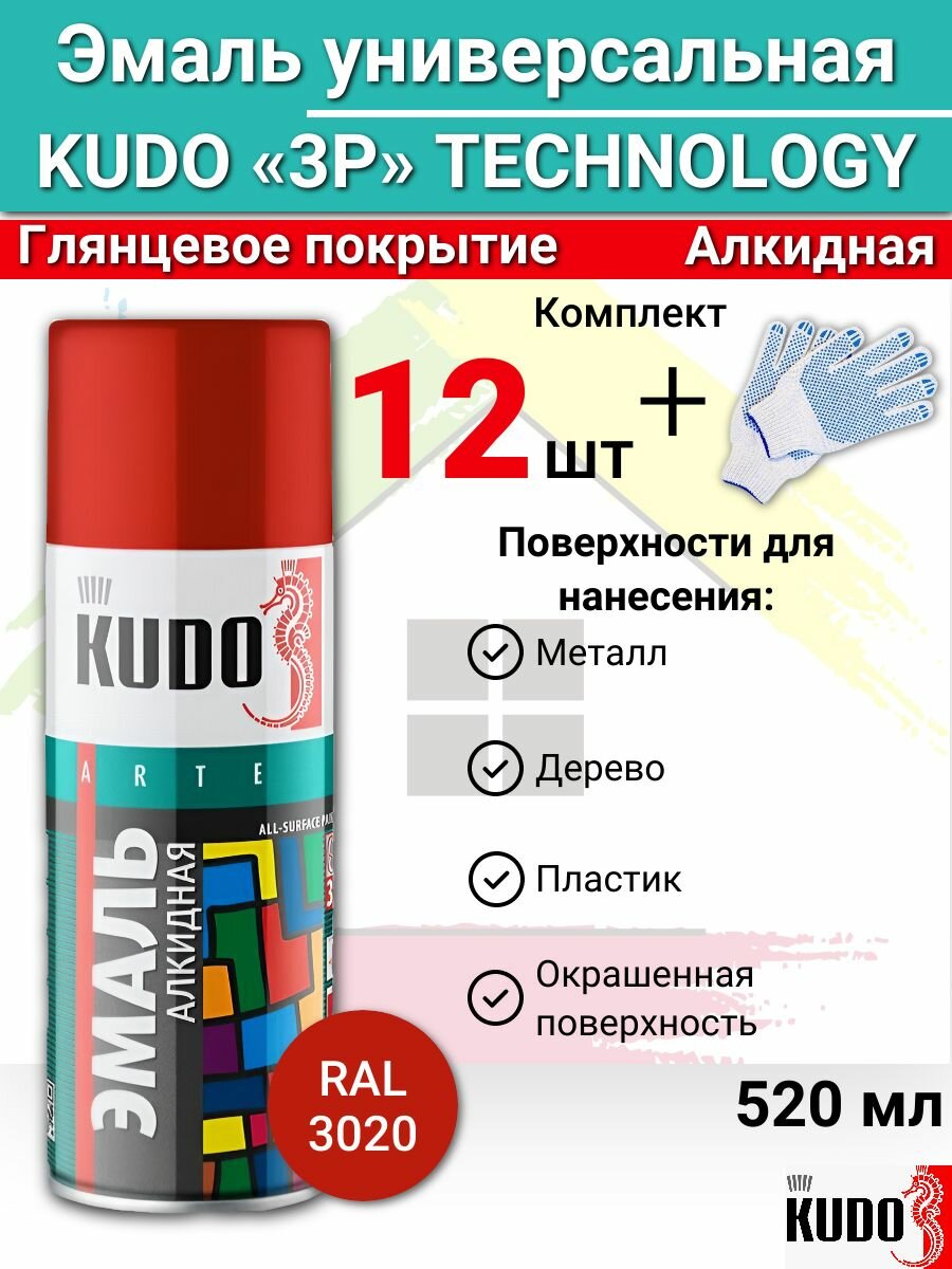 Эмаль универсальная KUDO 520 мл красная KU-1003 12 штук + перчатки