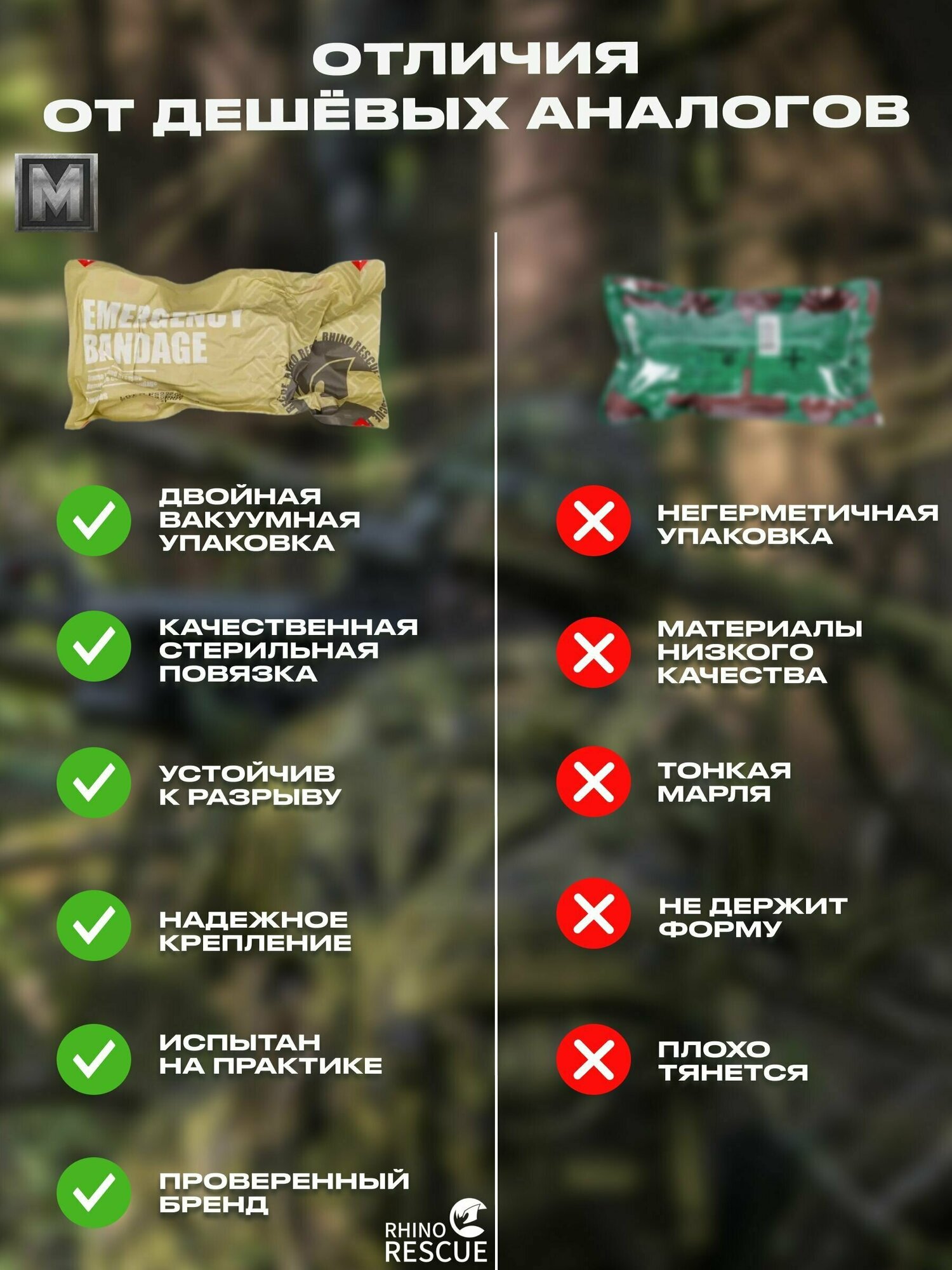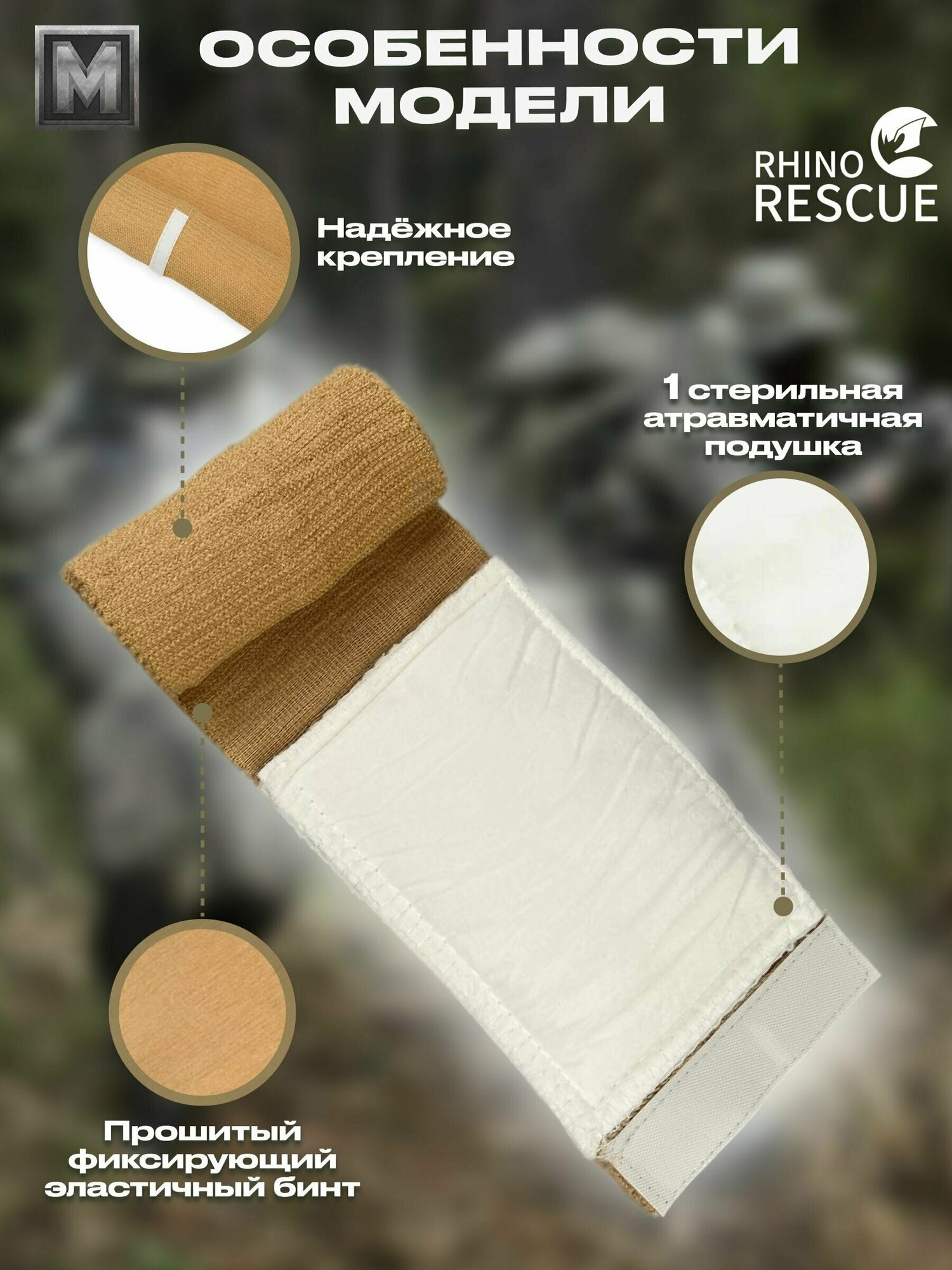 Компрессионный бандаж сверхвысокого качества RHINO Rescue Emergency Bandage Тактический бандаж! Это инновационный и надежный перевязочный пакет, позволяющий быстро и качественно остановить кровотечение и перевязать практически любые травмы в полевых условиях. Возможно наложение повязки самому себе даже одной рукой. Состоит из эластичного бинта, оснащенного аппликатором давления и застежкой, и стерильной неприлипающей атравматичной подушки. Герметичная вакуумная упаковка состоит из двух слоев: первый - внешняя оболочка из фольгированного материала защитного цвета, из которой откачан воздух, второй - внутренний, из подпергамента, обеспечивающий стерильность бандажа даже при повреждении внешнего слоя. Таким образом, повязка имеет два слоя защиты от грязи и герметична даже в том случае, если внешняя упаковка повреждена или надорвана;- стерильный перевязочный пакет, состоит из фиксирующего эластичного бинта и одной ватно-нетканой подушечки;- хорошо фиксируется на ране — имеет утягивающую петлю для повышения компрессии, а также фиксатор-липучку;- применяться для оказания первой помощи в экстренной и военно-полевой медицины. Типы и размеры: 6" 15 см*4 м - 1 подушечка 10*10;4" 10 см* 4м. - 1 подушечка/2 подушечки. Аналоги, которые можно приобрести также в нашем магазине: апполо • С одной подушечкой ППИ-Э (10) 1 - ширина бинта 10 см, подушечка 10см х17см длина 200 см ППИ-Э (15) 1 – ширина бинта 15 см, длинна 200 см, подушечка 15см х 17см длина 200 см ППИ-Э (15) А – ширина бинта 15 см, подушечка 30см х30см для обширных травм груди или спины (абдоминальный) длина 500 см • С двумя подушечками ППИ-Э (10) 2 - ширина бинта 10 см, подушечки 10см х17см длина 200 см ППИ-Э (15) 2 – ширина бинта 15 см, подушечки 15см х 17см длина 200 см. Оригинальная конструкция изделия позволяет эффективно использовать технику растягивания и перекручивания бинта во время перевязки раны , что позволяет создать оптимальное давление на рану для остановки кровотечения- кровоостанавливающее средство. В комплексе с использованием Медплант-Гепоглос-Гемоспас-гелепран-гемостатик-гемостатической кубки-кровоостанавливающей губки, прекрасно помещающиеся в любой подсумок/подсумки/сумку медицинскую/медицинскую укладку/подсумок медицинский- гарант иммобилизации раны- остановка кровотечения- на страже вашего здоровья. Изделие представляет собой фиксирующий эластичный бандаж («бинт»), включающий затягивающий элемент, неподвижную подушечку, подвижную подушечку (в варианте исполнения с 2-мя подушечками) и фиксирующий элемент. Подходит как средство заживления ран на голове (повязка на голову/повязка на руку/повязка на ногу/В зависимости от типа изделия подушечки имеют следующие размеры: при ширине бинта 10 см – 17 см х 10 см при ширине бинта 15 см – 17 см х 15 см. В случае, если ранение не сквозное, то при использовании ППИ(Э) с двумя подушечками, подвижная подушечка, сложенная с неподвижной, накладываются на рану как одна, или может быть просто снята с бандажа. Фиксирующий эластичный бандаж («бинт») представляет собой эластичный бинт особого плетения. Ширина бинта медицинского из аптечка тактическая , как уже говорилось ранее, представлена в двух исполнениях – 10 см. или 15 см. Повязка на рану апполо-Скатка эластичного бандажа прошита нитью, с помощью которой бинт фиксируется в скрученном состоянии. Это необходимо для того, чтобы изделие не 
