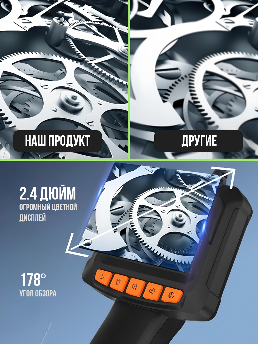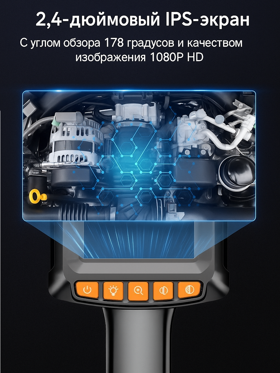 Портативный промышленный эндоскоп INSKAM G20-M — универсальный инструмент для автосервиса, сантехнических работ, диагностики бытовой техники и промышленной электроники. Качество изображения: Оборудован 2.4-дюймовым HD-экраном с широким углом обзора 178°, поддерживает разрешение 1080P для точной передачи деталей даже в труднодоступных местах. Компактный объектив: Ультракороткая линза длиной 3,5 см — вдвое меньше традиционных, легко помещается в узкие трубы и изгибы. Подходит для использования в ограниченных пространствах. Улучшенная конструкция: Используется новая технология обработки изображения (оптика + камера + алгоритм), обеспечивающая стабильную и чёткую картинку. Сверхпроводящий сердечник из чистой меди и утолщённая оболочка гарантируют износостойкость и долгий срок службы. До 5 часов работы: Аккумулятор ёмкостью 2000 мАч обеспечивает до 5 часов непрерывной работы без подзарядки. Идеально для длительных инспекций. Простота использования: Работает сразу после включения — не требуется Bluetooth, Wi-Fi или установка приложений. Полный комплект: В наборе — три сменных насадки: • боковое зеркало (90°), • магнит для металлических предметов, • крючок для извлечения инородных тел. Также в комплекте — держатели для фиксации (3 шт.). Применение: • Ремонт автомобилей • Диагностика бытовой техники • Проверка труб, канализаций и электросетей