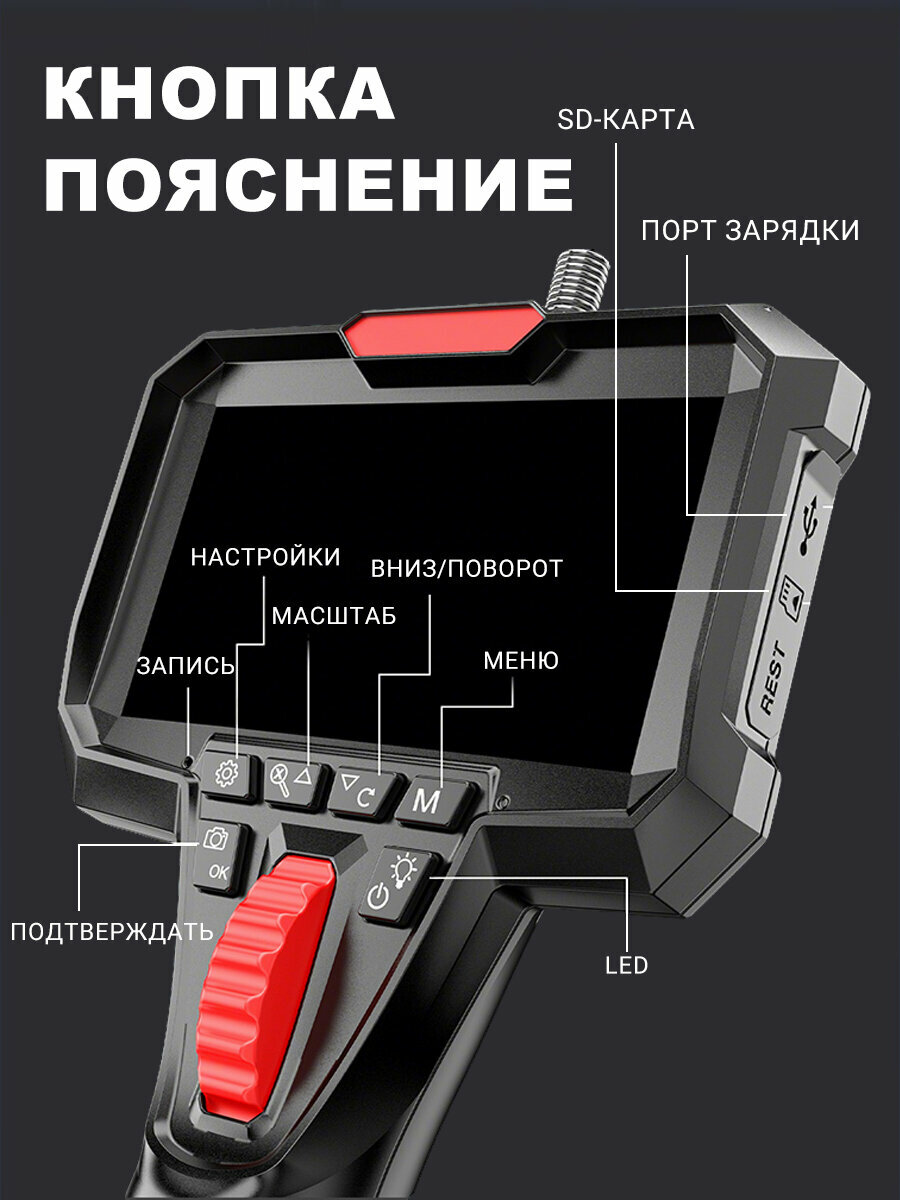 Эндоскоп ручной поворотный 180°+180° с 4.3"-дюймовым цветным HD 1080P дисплеем,2 камерами и фотосъёмкой на 6.5mm 1m кабеле, Картинку можно перевернуть на 180˚, увеличить/уменьшить и остановить её, регулировать LED. Можно использоваться во многих случаях, когда необходим визуальный техосмотр.