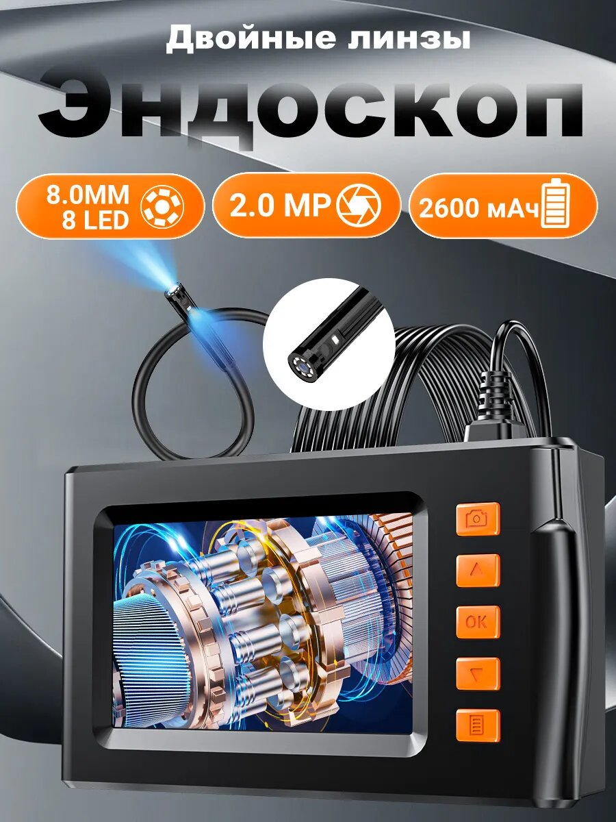 Эндоскоп с 4.3"-дюймовым цветным HD 1080P дисплеем, 2 камерами и фотосъёмкой на 8mm 2m кабеле, можно использоваться во многих случаях, когда необходим визуальный техосмотр. 1. в основном используется в автодвигателах, 2. в моторах мотоциклов, лодок, грузовиков, самолетов, 3. в системах отопления, вентиляции и кондиционирования воздуха, 4. в производстве электроэнергии, газа и масла(трубке) и так далее. Функция: ••• Нажать кнопку(вверх) переключить камеру переднюю и бококую когда чистый на экране. ••• Меню: Картинку можно перевернуть на 180˚, увеличить/уменьшить её, регулировать LED. ••• Обязательно нужно вставить карту памяти чтобы используется снять фото и видео, и эндоскоп не сможет напрямую работать с телефоном ! • Эндоскоп автомобильный оснащен 4,3-дюймовым IPS-экраном с фокусным расстоянием 2-10 см для удобной диагностики и ремонта. • 8 высокоинтенсивных светодиода, 3 режима яркости света, обеспечивают визуальную поддержку для осмотра при любом уровне освещенности. • Водонепроницаемость по стандарту IP67 (только для объектива), позволяет использовать эндоскоп в водной и масляной средах. • Батарея 2600 mАh, работает на 4-5 часа, зарядиться на 3 часа. Чтобы продлить срок службы, рекомендуется заряжать его каждые три месяца