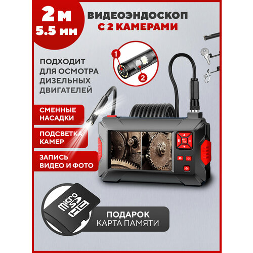 Эндоскоп с экраном и 2 камерами, карта памяти на 8 гб в подарок, диаметр 5.5 мм, длина 2 м
