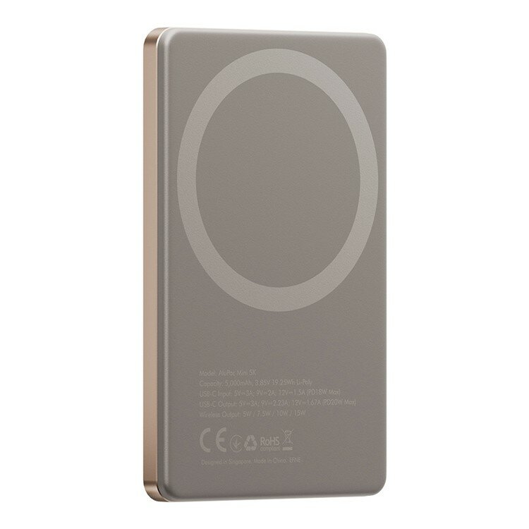 Магнитно-совместимый алюминиевый внешний аккумулятор ёмкостью 5000 мАч. Этот ультракомпактный внешний аккумулятор, изготовленный из лёгкого алюминия, имеет размер кредитной карты и удобно помещается в карман. Он оснащён выходом USB-C для одновременной зарядки двух устройств.