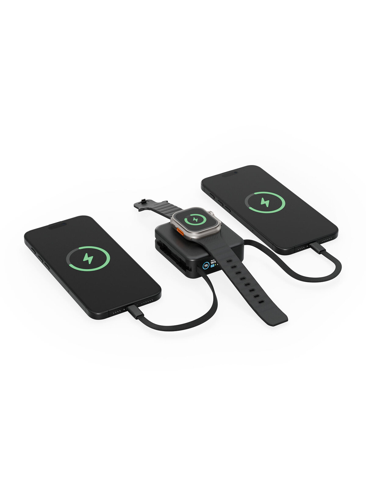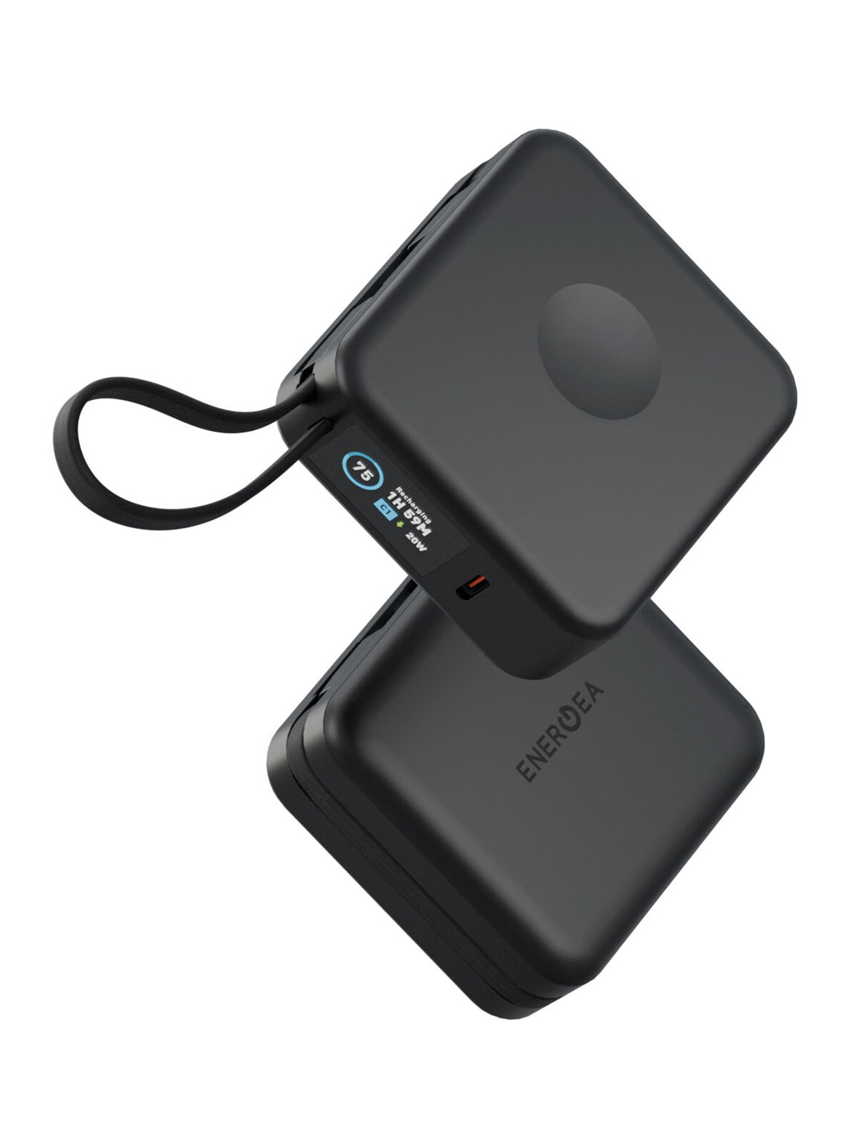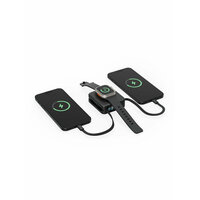 Компактный внешний аккумулятор EnergEA MagPac Mini Plus емкостью 10000 мАч со встроенной беспроводной зарядкой и функцией MagSafe обеспечит быстрое и безопасное пополнение энергией до 4 мобильных устройств одновременно. Оснащен двумя встроенными USB-C кабелями и зарядной док-станцией для Apple Watch на задней панели устройства. Встроенная система управления для крепления кабелей также служит шнурком при размещении в руке. Функция сквозной зарядки позволяет одновременно с пополнением энергией самого аккумулятора заряжать подключенные к нему гаджеты. Благодаря мощным магнитам АКБ надежно фиксируется на задней панели смартфона и гарантирует точное совмещение устройств для максимально быстрой зарядки. Поддержка быстрой проводной зарядки мощностью 20 Вт позволяет зарядить устройство до 60% за 30 минут. Система безопасности убережет ваши гаджеты от скачков напряжения, короткого замыкания и перегрева, а светодиодный индикатор покажет состояние батареи. Вход USB-C: 5V/3A; 9V/2A (PD 18W max) Выход USB-C: 5V/3A; 9V/2.22A; 12V/1.67A (PD 20W max) Вход кабеля USB-C1: 5V/3A; 9V/2A (PD 18W max) Выход кабеля USB-C1: 5V/3A; 9V/2.22A; 12V/1.67A (PD 20W max) Выход кабеля USB-C2: 5V/3A; 9V/2.22A; 12V/1.67A (PD 20W max) Суммарный выход USB-C + USB-C1 + USB-C2: 5V/3A (максимум 15 Вт) Беспроводной выход (смартфон): 5 Вт / 7.5 Вт / 10 Вт / 15 Вт Беспроводной выход (часы): 2.5 Вт Общий выход: 5V/3A (максимум 15 Вт)