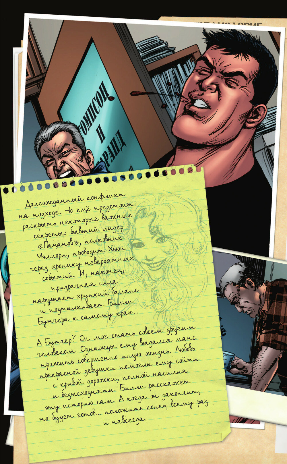 Долгожданный конфликт на подходе. Но ещё предстоит раскрыть некоторые важные секреты: бывший лидер «Пацанов», полковник Мэллори, проводит Хьюи через хронику невероятных событий. И, наконец, призрачная сила нарушает хрупкий баланс и подталкивает Билли Бутчера к самому краю… А Бутчер? Он мог стать совсем другим человеком. Однажды ему выдался шанс прожить совершенно иную жизнь. Любовь прекрасной девушки помогла ему сойти с кривой дорожки, полной насилия и безысходности. Билли расскажет эту историю сам. А когда он закончит, то будет готов… положить конец всему раз и навсегда.