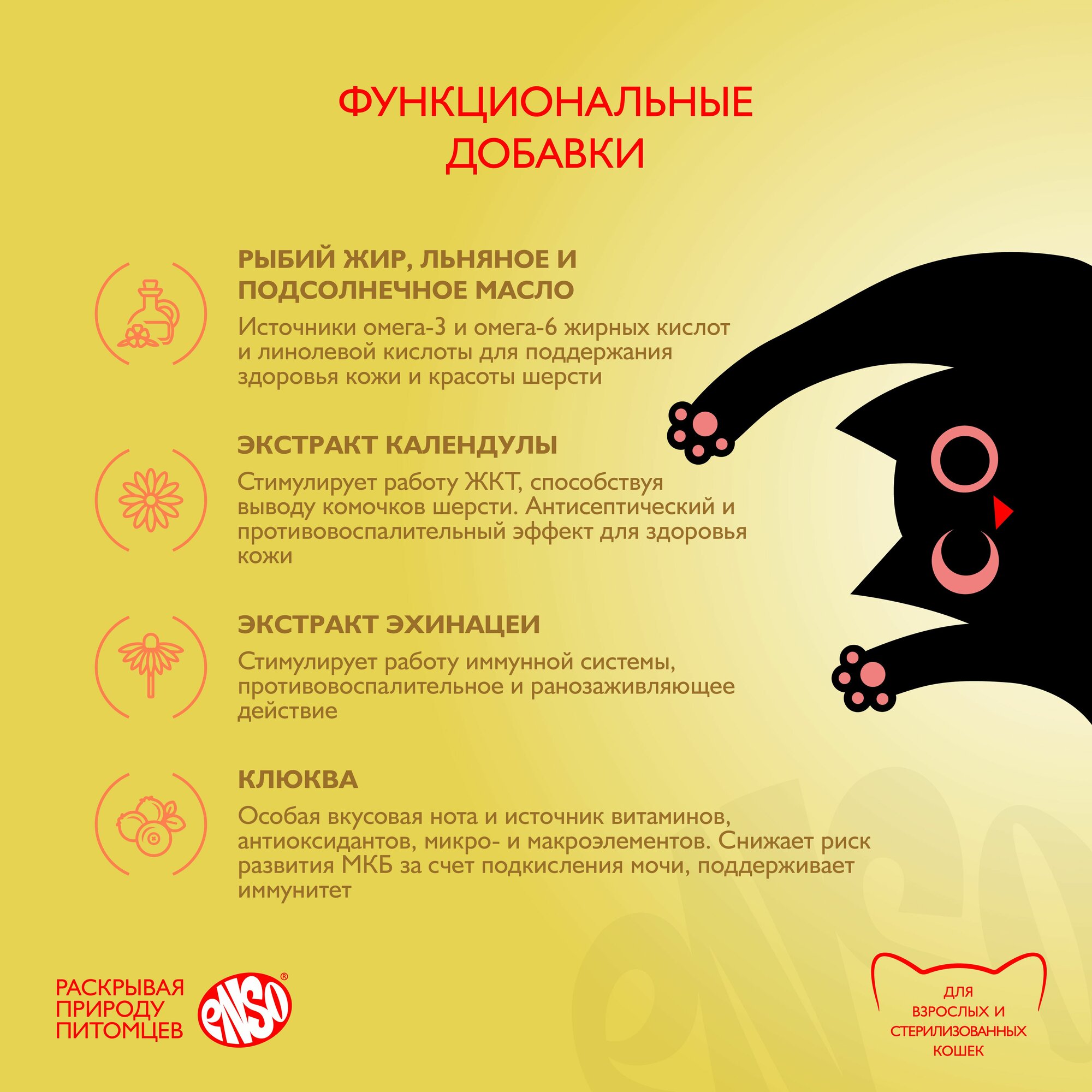 ENSO® Влажный полнорационный корм для взрослых кошек, кусочки в соусе с курицей. Для изготовления корма использовано отборное мясо и мясные субпродукты первой категории от проверенных поставщиков. По своей природе кошки достаточно избирательны в еде, это практически запрограммировано в их ДНК. Благодаря сбалансированному составу и натуральным ингредиентам, нежные мясные кусочки ENSO® в аппетитном соусе очаруют кошек уже при первом знакомстве с кормом. Низкозерновая рецептура без глютена с тщательно подобранными витаминами и минералами, отсутствие ГМО и идеальное сочетание вкуса позволят кошкам всегда оставаться активными и здоровыми, проявлять и сохранять свою настоящую сущность. ENSO® c курицей для взрослых и стерилизованных кошек обогащен всеми необходимыми добавками для поддержания организма: *Рыбий жир, льняное и подсолнечное масло (источники Омега 3, 6 жирных кислот; линолевой кислоты) поддерживают здоровье кожи и красоту шерсти *Экстракт календулы стимулирует работу ЖКТ *Клюква, DL-метионин - регулирует кислотность мочи, профилактика МКБ *Экстракт эхинацеи стимулирует работу иммунной системы *Таурин - незаменимая аминокислота для здоровья кошек всех возрастов *L-карнитин поддерживает оптимальный вес питомца