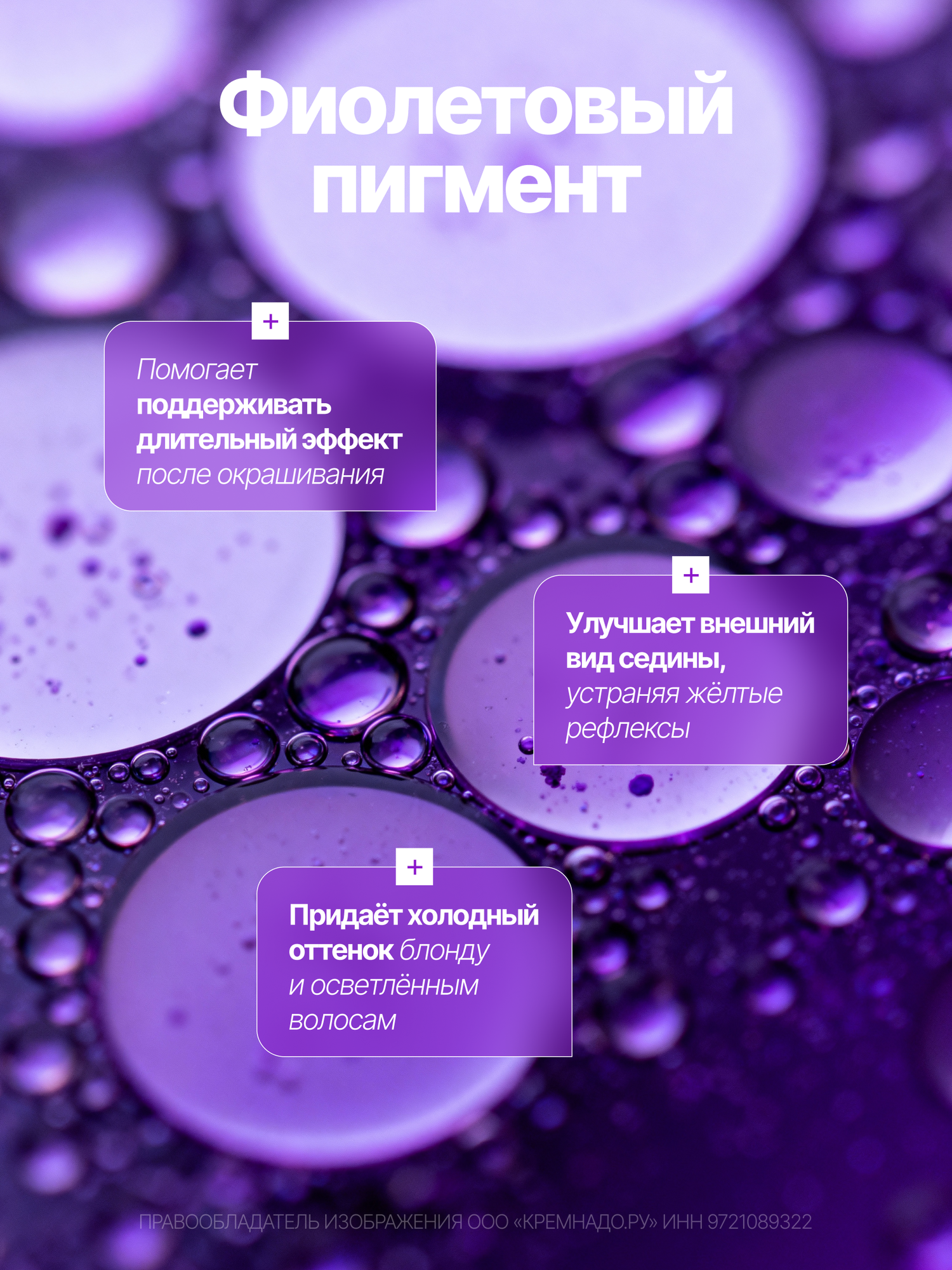 Маска с фиолетовым пигментом нейтрализует нежелательные тёплые оттенки по всему полотну волос, делая их мягкими, шелковистыми и блестящими. Средство содержит экстракт ромашки, масла виноградных косточек и макадамии, которые питают, восстанавливают структуру волос и оказывают антиоксидантное действие.