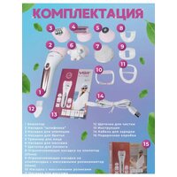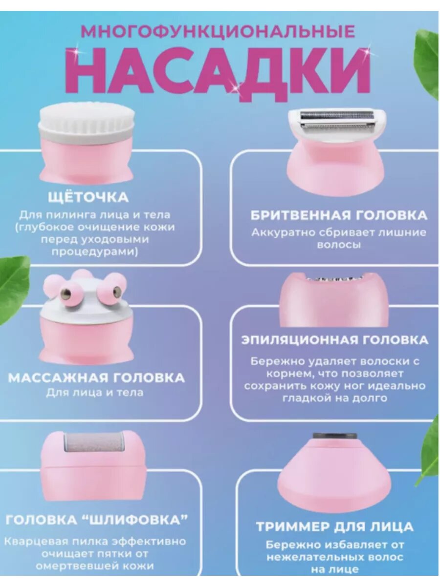 | Насадки | для бритья, для педикюра, для пилинга, для точечного удаления волос, насадка для деликатных зон, насадка-ограничитель, насадка-триммер, охлаждающая |