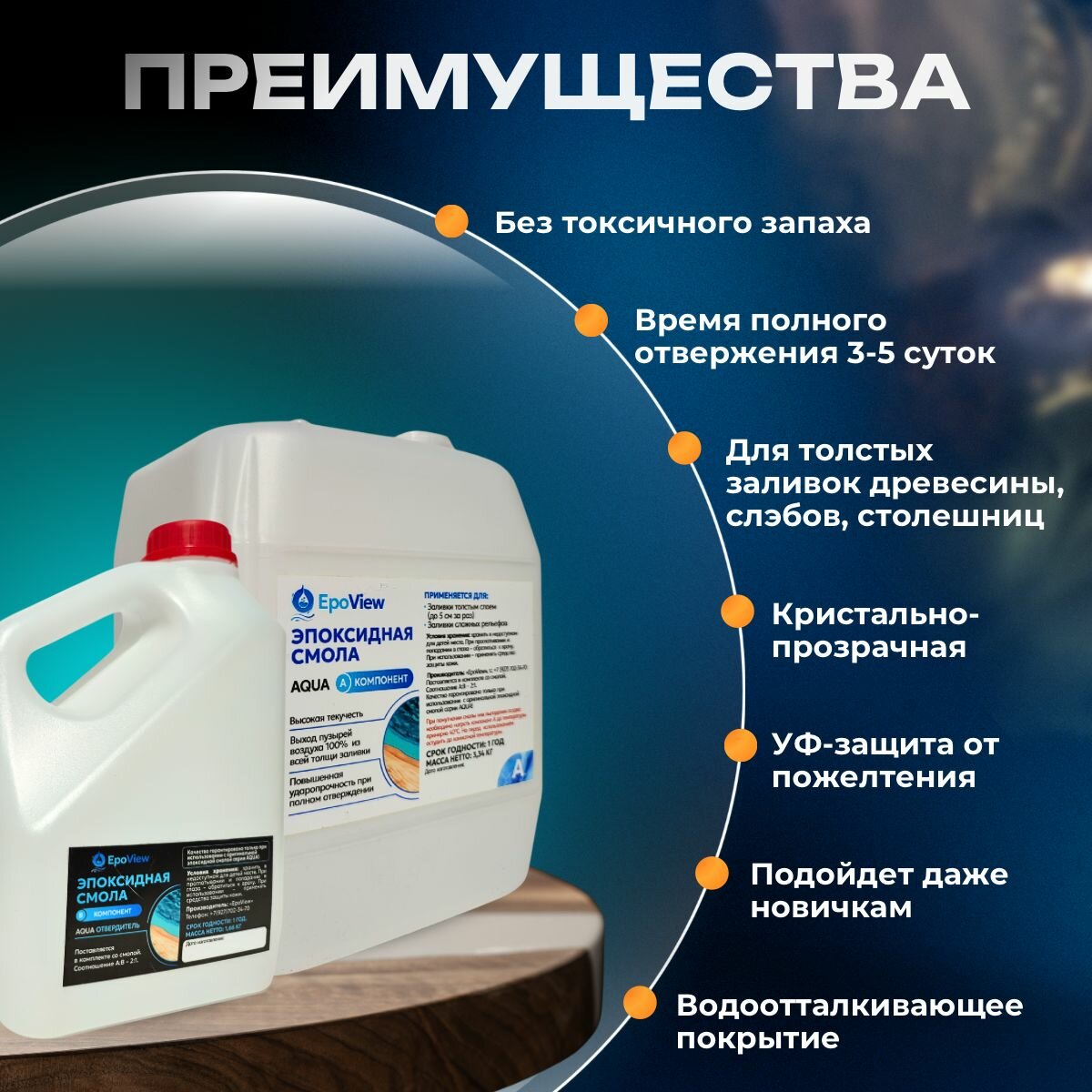 - Двухкомпонентная профессиональная эпоксидная смола EpoView серии AQUA разработанная специально для толстослойных (до 5см), объемных заливок древесины, слэбов, столов - рек, столешниц. Повышенная ударопрочность - специально для столешниц. Широко применяется в создании мебели из дерева и заливке объемных/больших поверхностей наливных полов. После конечного отверждения возможна механическая, абразивная обработка для придания необходимой формы изделиям.