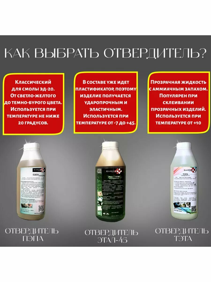 Эпоксидная смола ЭД20 в комплекте с отвердителем Этал 45М - это очень хороший многофункциональный клей, который используется для создания и ремонта ответственных деталей, авиа-судостроении, авто тюнинга, герметизации бетонных, деревянных и металлических поверхностей.