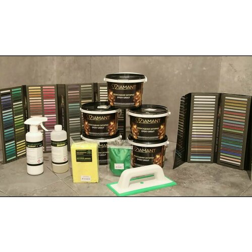 Фуга на эпоксидной основе DIAMANT применяется для заполнения межплиточных швов напольной и стеновой облицовочной плитки любых видов в помещениях с любым уровнем влажности и эксплуатационной нагрузкой, а также для аналогичных работ вне помещений. Образует высокопрочный водонепроницаемый шов, устойчивый к образованию трещин и истирающему воздействию, образованию грибка, плесени и пятен. Рекомендована для применения в сложных условиях - долговременное нахождение под водой, перепады температур, химическое и механическое воздействие, деформация основания и т. п. Совместима с системами подогреваемых полов. После полного отверждения безопасна для здоровья человека и животных. Особенности и преимущества- универсальность - любые виды плитки, любые основания, любые условия эксплуатации; - расширенная цветовая палитра позволяет выбрать индивидуальное решение; - исключительная прочность и водостойкость шва; - устойчивость к химическим веществам, атмосферным факторам, перепадам температур; - может быть использована в качестве клея для тонкой мозаики; - не содержит свободного красителя, благодаря чему не оставляет следов на облицовке. Обратите Продукт состоит из двух компонентов, требующих смешивания в строго определенной пропорции. Допускается частичное смешивание - для точного определения массовых частей рекомендуем использовать электронные весы. Способ примененияСмешанной в рекомендованных пропорциях смесью при помощи эластичного шпателя тщательно заполняют межплиточные швы, стараясь не оставлять излишков раствора на поверхности плитки. Первичную очистку облицовки проводят до начала отверждения, не позднее 40 минут после приготовления фуги, аккуратно очищая поверхность круговыми движениями слегка влажной, хорошо отжатой и часто споласкиваемой целлюлозной губки, попутно заглаживая швы. Финишная очистка с помощью очистителя эпоксидных остатков DIAMANT+ необходима для удаления с поверхности плитки эпоксидной плёнки и производится в интервале от 4 до 12 часов после смешивания компонентов.