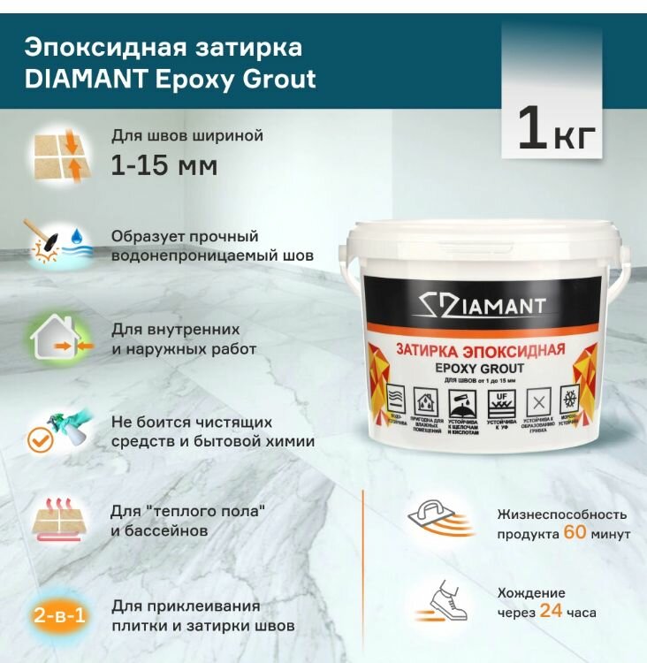 Эпоксидная затирка швов DIAMANT (Диамант) 001004 предназначена для заполнения и защиты межплиточных швов на стенах и полах в санузлах, на кухнях, во влажных помещениях, бассейнах, системе 'теплый пол'.