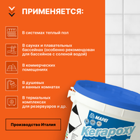Затирка мапей Керапокси подходит для стен и полов в помещениях с высокими химическими нагрузками, таких как промышленные и пищевые производства, химические лаборатории, автосервисы и т. д. Она также может применяться для ремонта старой поврежденной затирки и подходит для использования в бассейнах, банях и хаммамах.