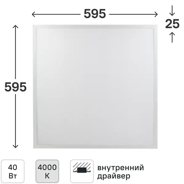 Светодиодная панель мощностью 40Вт и световым потоком 3060Лм. Светит, как ультратонкая панель – приятным равномерным светом, и не уступает по яркости, при этом имеет значительно более низкую цену. Драйвер встроен в корпус – светильник полностью готов к установке и легко монтируется на потолок любого типа – как в качестве встраиваемого светильника, так и накладным или подвесным способом. Легко устанавливается в потолки Армстронг, на гипсокартонные, бетонные потолки. Позволяет в разы ускорить, а значит и удешевить монтаж. Светильник создайт качественный ровный свет: индекс цветопередачи Ra - выше 80, что обеспечивает отличную цветопередачу; коэффициент пульсаций - ниже 5% - соответствует самым жестким требованиям СанПин. Такое освещение рекомендовано для учебных, дошкольных, медицинских учреждений. Является идеальным решением для офисных и общественных пространств. Цветовая температура: 4000 К - естественный дневной свет. Габаритная яркость: &8804; 2000 кд/м2. Класс светораспределения: П. Класс по ограничению яркости: 1.