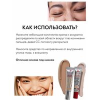 Нанесите небольшое количество крема и аккуратно распределите по всей области вокруг глаз кончиками пальцев, давая СС-пигменту раскрыться. Наносите средство по направлению от внутреннего уголка глаза, к внешнему.