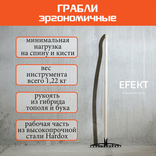 Рабочая часть грабель от компании Efekt производится из невероятно прочной шведской стали HARDOX. Такую сталь используют для изготовления ковшей экскаваторов, так что волноваться, что очередной камень просто погнет зубья грабель не стоит. HARDOX имеет свойства закаленной стали, а потому головка инструмента способна выдержать даже вес легковой машины.