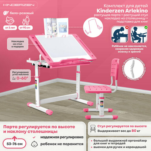 Эргономичный комплект парта и стул Kinderzen Arlekino с аксессуарами белый/розовый: сравнение цен, характеристики, фото, актуальное наличие и цены.
